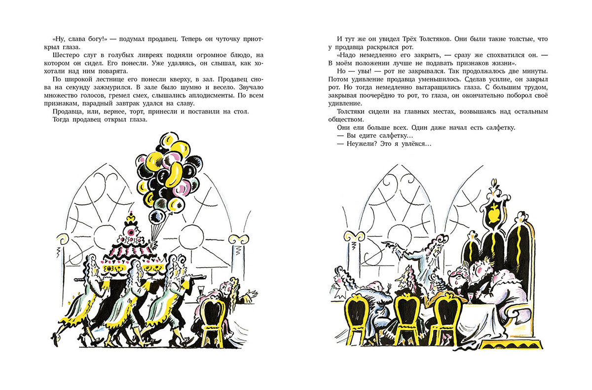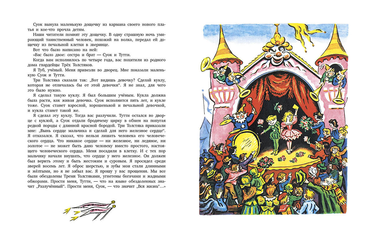 В одной неназванной стране правят Три Толстяка: в их алчных руках вся власть, ресурсы и жизни людей. Но прямо под носом у них назревает настоящее восстание: оружейник Просперо и гимнаст Тибул ведут народ на штурм Дворца Трёх Толстяков. А во Дворце между тем своя беда: люби маякукла наследника Тутти испорчена мятежными гвардейцами! Только мудрый и учёный доктор Гаспар Арнери способен её починить. Но судьба приводит доктора к цирковой танцовщице Суок — девочке, которая как две капли воды похожа на ту самую куклу. И тогда рождается опасный план: Суок предстоит разыграть роль куклы наследника Тутти и освободить взятого в плен оружейника Просперо. Тогда власть Трёх Толстяков будет свергнута, а справедливость восстановлена: добро победит зло, простые и настоящие человеческие чувства — душевную чёрствость и жестокосердие, свобода — неволю. Роман для детей «Три Толстяка», созданный Юрием Олешей в 1924 году, за свои почти сто лет жизни выдержал множество переизданий, экранизаций и театральных постановок, был переведён на иностранные языки. Серьёзный социальный конфликт в нём соседствует со сказочными приключениями, необычайными превращениями и увлекательными сюжетными перипетиями, которые неизменно продолжают захватывать внимание читателей. Великолепные иллюстрации Бориса Калаушина, вошедшие в настоящее издание, не только вторят остроумию и образности текста, но вместе с ним создают эту невероятную историю от начала и до конца.