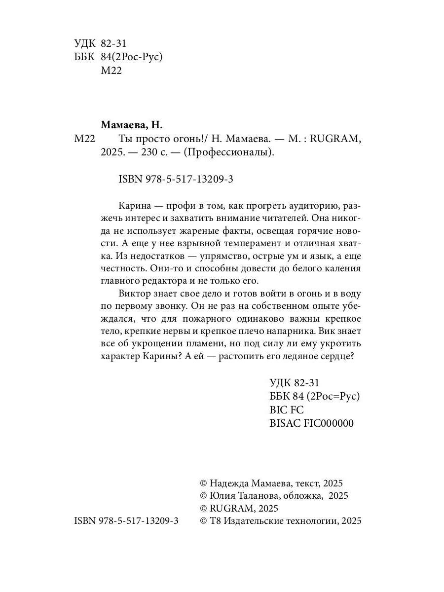 Handling time: 19 days Автор: Мамаева Надежда, «Ты просто огонь!»: Карина — профи в том, как прогреть аудиторию, разжечь интерес и захватить внимание читателей. Она никогда не использует жареные факты, освещая горячие новости. А еще у нее взрывной темперамент и отличная хватка. Из недостатков — упрямство, острые ум и язык, а еще честность. Они-то и способны довести до белого каления главного редактора и не только его. Виктор знает свое дело и готов войти в огонь и в воду по первому звонку. Он не раз на собственном опыте убеждался, что для пожарного одинаково важны крепкое тело, крепкие нервы и крепкое плечо напарника. Вик знает все об укрощении пламени, но под силу ли ему укротить характер Карины? А ей — растопить его ледяное сердце?