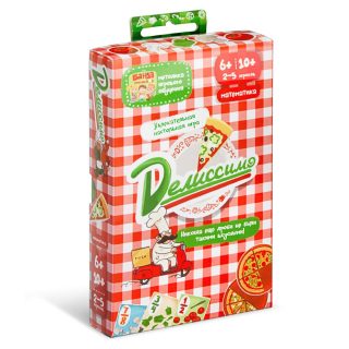 Возраст: 6+, 8+, 10+ (в зависимости от вариантов игры). Предмет игры: математика, дроби. Кол-во игроков: от 2 до 5. Время игры: 10-20 мин. Сложная тема дробей подаётся в "Делиссимо" в очень доступной и аппетитной форме. Дети на образном уровне усвоят операции с долями и перейдут к дробям, не отвлекаясь от интересного занятия.Синьора просила пять восьмых с помидорами! В этой милой игре Вам предстоит немало потрудиться, так как Вы работаете на известную и уважаемую итальянскую пиццерию "Делиссимо". Её привередливые клиенты любят заказывать пиццу не целиком, а частями.Соответственно, с долями и дробями Вы подружитесь настолько, что Вам в этом деле не будет равных.Игровой набор выполнен в очаровательном итальянском стиле. Он включает как привычные прямоугольные карты с заказами, так и оригинальные круглые карточки - это подносы с различным количеством кусочков пиццы на них.Помимо сыра и оливок на пиццах в разных сочетаниях присутствуют помидоры, грибы и перцы - по два ингредиента на каждой.Самым маленьким игрокам "Делиссимо" поможет научиться сопоставлять доли, детям постарше игра поможет научиться оперировать числовой записью дробей и совершать разные действия с дробями.В правилах для самых старших у игроков появляется больше возможностей для внезапных действий и сложных ходов, что делает игру ещё динамичнее, увеличивая количество вариантов развития событий.
