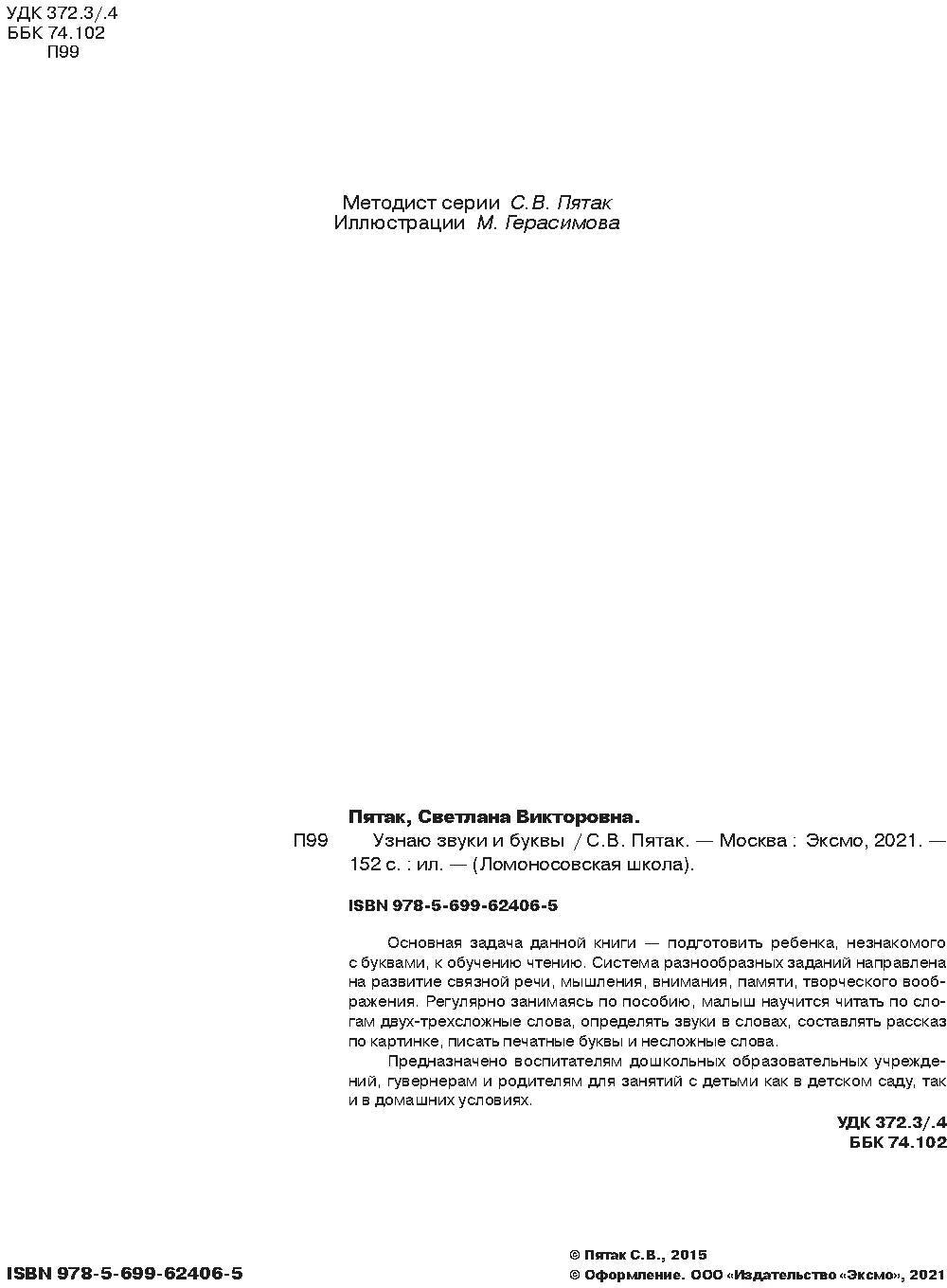 Аннотация к книге "Узнаю звуки и буквы: для детей 4—5 лет. 2-е издание" Пятак С. В.:Основная задача данной книги — подготовить ребенка, незнакомого с буквами, к обучению чтению. Система разнообразных заданий направлена на развитие связанной речи, мышления, внимания, памяти, творческого воображения. Регулярно занимаясь по пособию, малыш научится читать по слогам двух-трехсложные слова, определять звуки в словах, составлять рассказ по картинке, писать печатные буквы и несложные слова.Пособие предназначено воспитателям дошкольных образовательных учреждений, гувернерам и родителям для занятий с детьми как в детском саду, так и в домашних условиях. Читать дальше…