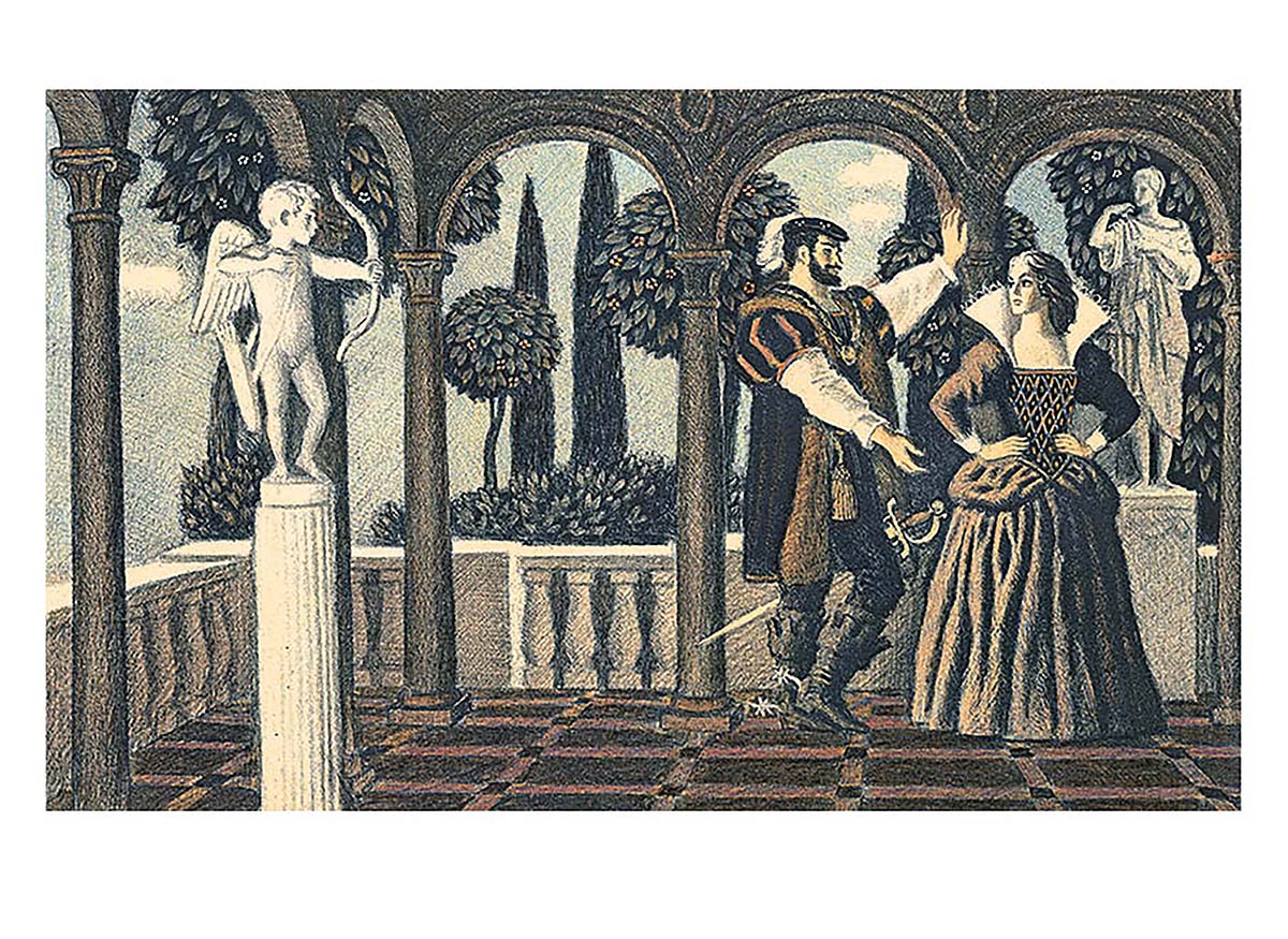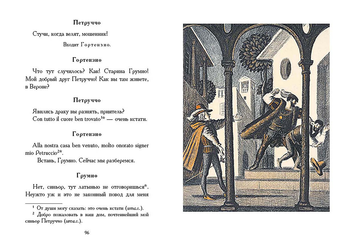 Художник Юрий Гершкович своими иллюстрациями отсылает к театральной постановке. Перед читателем словно перед зрителем разворачиваются декорации и мизансцены, по-итальянски яркие и эмоциональные.