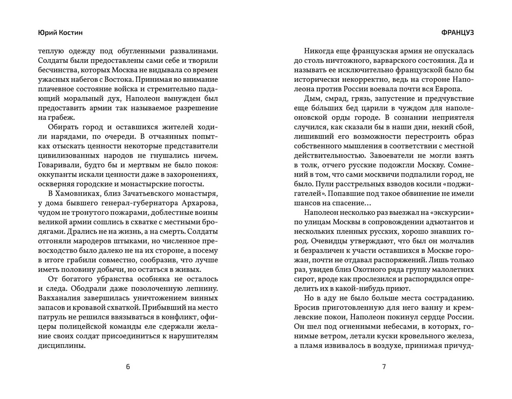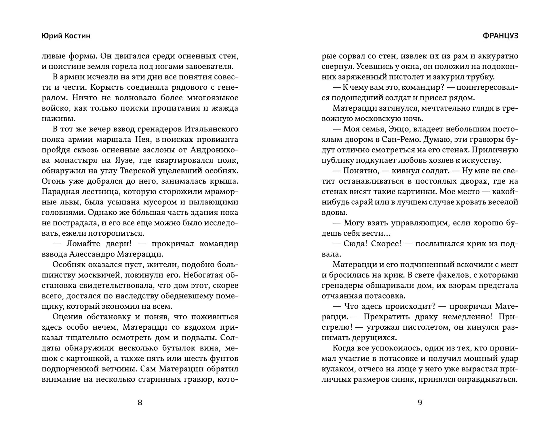 Handling time: 14 days История не заканчивается. Иногда события и предметы словно вынуты из линейного потока и кажутся митчелловской "бесконечной матрешкой раскрашенных моментов". Романы Юрия Костина "Немец", "Русский", "Француз" - тот случай, когда прошлое продолжает напоминать о себе, управляя выбором и судьбой своих героев в реальном настоящем. Яблоневый сад в деревне Хизна осенью 1941-го, советская "Пирожковая" на Рождественке и Октоберфест в Мюнхене, карибский аэродром, шаманская река и альпийское озеро, бульвар Санта-Моника, штаб Кутузова в Тарутино и обсерватория НАСА на вершине Мауна-Кеа - вот только некоторые "пазлы" из хроник Антона Ушакова. Новый роман Юрия Костина "Француз" - о преодолении границ и конфликтов, даже самых болезненных: между людьми, которых еще вчера называли "союзниками" или, например, "братскими народами". Исчезнувшие сокровища сожженной Москвы 1812 года, борьба за которые продолжается и в наши дни (причем вдали от континентальной Европы), оказываются совсем не тем, чего от них ждут герои. Это не вещи - а родственные связи, тянущиеся через века и вопреки политике, Юрий Костин магически комбинирует сцены настоящего (расследование Антона Ушакова), дневники из прошлого и военную историю, пожалуй, самого таинственного и самого величественного - пушкинского периода российской истории, начавшегося с убийства императора...