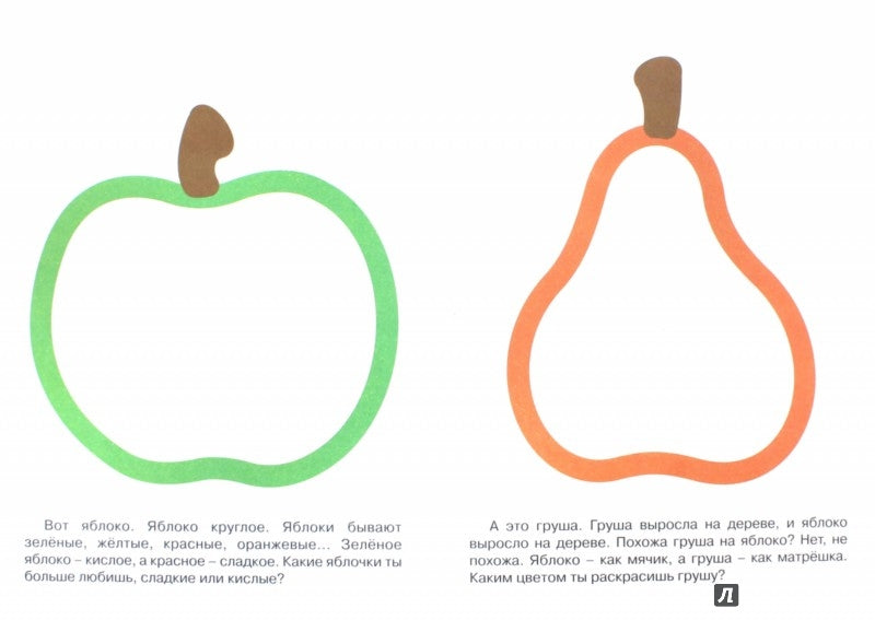 • Очертания картинок плавные, без углов и сложных изгибов, поэтому ребенку легко будет повторить их силуэт внутри контурного изображения. Многие рисунки кроха может дополнить по своему желанию.