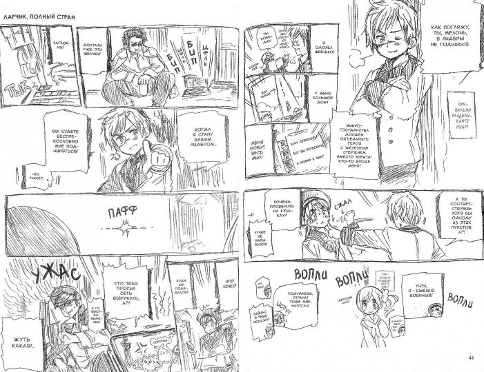 Handling time: 19 days Воистину, мировая история становится в сто раз интереснее, когда она показана через взаимоотношения персонажей, олицетворяющих собой 40 стран-участников мирового политического процесса. И особенно - если в характерах героев так удивительно точно и узнаваемо, переданы черты представляемых ими наций. Манга Химаруи Хидэкадзу заставляет по-новому взглянуть на события, происходившие в мире на протяжении более чем двухсот лет, и либо задуматься над судьбами человечества и либо посмеяться от души.