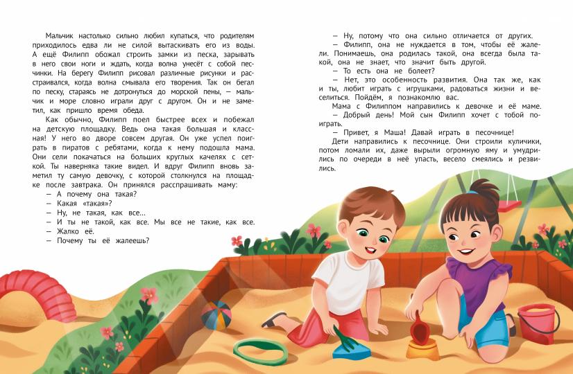 Уроки доброты - это лучшее, что мы можем дать детям. Именно в дошкольном возрасте ребёнок учится осознавать и замечать чувства, сопереживать и сострадать, помогать и заботиться. Но как подобрать слова и объяснить, что такое доброта, из чего она складывается и почему это важно?Дети по природе своей консервативны, поэтому так важно, чтобы взрослые обращали внимание на разнообразие мира вокруг и на то, что это разнообразие нас не разделяет, а обогащает. Мы можем по-разному выглядеть, у нас может быть разный достаток, разные семьи, разные сильные и слабые стороны, но при этом у нас много общего. Умение замечать точки соприкосновения - важный коммуникативный навык, который не просто делает жизнь радостнее, но и чрезвычайно полезен.Детский психолог и арт-терапевт Елена Бурьевая придумала истории о мальчике Филиппе, который вместе с родителями узнаёт много нового о мире: он знакомится с детьми, которые выглядят и ведут себя иначе, у которых могут быть другие финансовые возможности или которые живут в семье с одним родителем. Филипп убеждается, что отличия не помеха общению и играм.Читайте вместе со своим малышом сказки и обсуждайте их. В конце книги есть рекомендации для родителей.