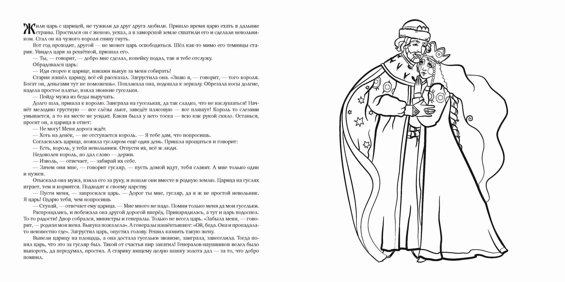 Царицыны гусельки. Раскраска О книге Классическая русская народная сказка в кратком пересказе с чёрно-белыми иллюстрациями, технологически подготовленными к раскрашиванию карандашами или красками. … Отправился молодой царь в дальние страны и попал в неволю к иноземному королю. Прослышала об этом его жена и задумала вызволить из беды мужа… Сказки существую для того, чтобы их рассказывать! Книга даёт прекрасную возможность детям и взрослым заново пересказать любимую сказку и по-своему её раскрасить.
