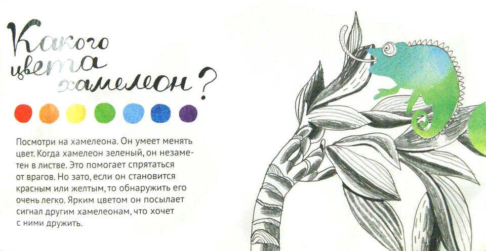 Интерактивная развивающая познавательная книга о значении цвета в природе.Подходит для самостоятельных и совместных занятий.1. Обучает цветам в игровой форме2. Развивает мелкую моторику3. Наблюдательность4. Аналитические способности5. Стимулирует ребенка к самостоятельным занятиям с книгой6. Приучает к чтению (извлечению полезных навыков и знаний из книги)Животные и растения раскроют свои секреты и удивительные способности менять окраску. С помощью движущихся элементов юный читатель сможет смешивать краски, увидит, как хамелеон меняет цвет, проследит за созреванием помидора, узнает, как цветок меняет оттенок.