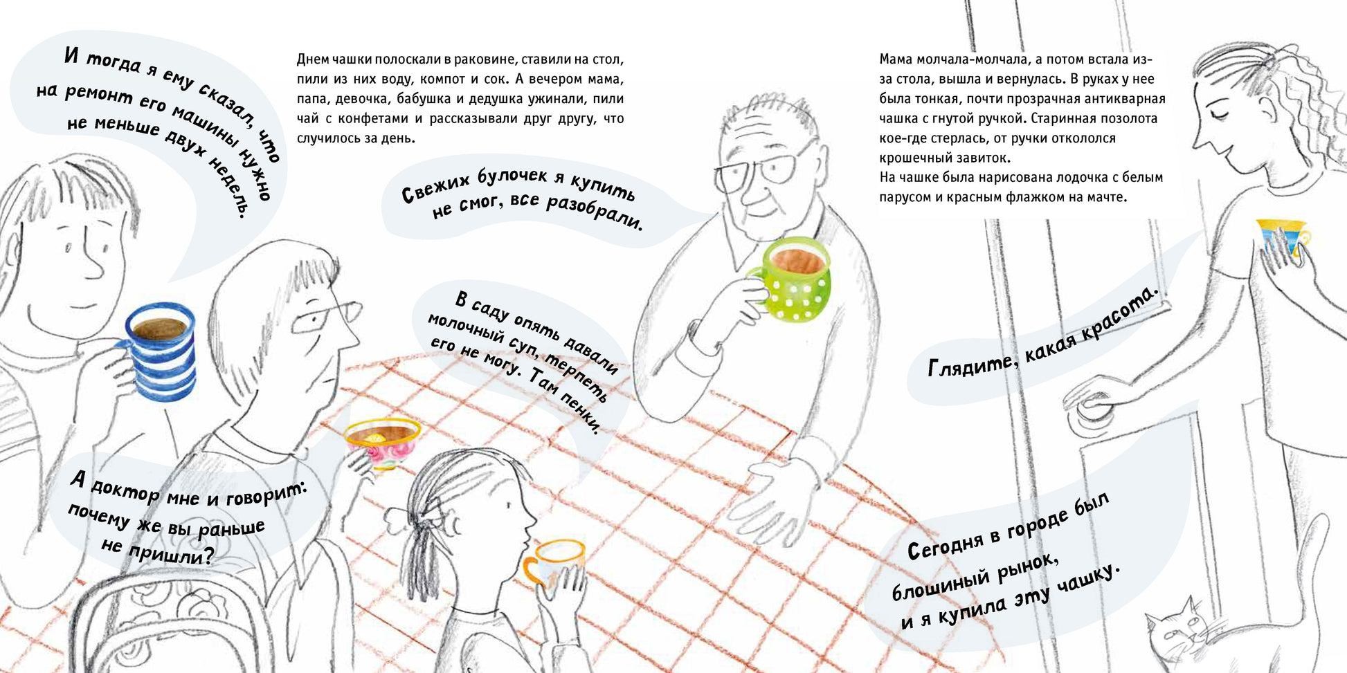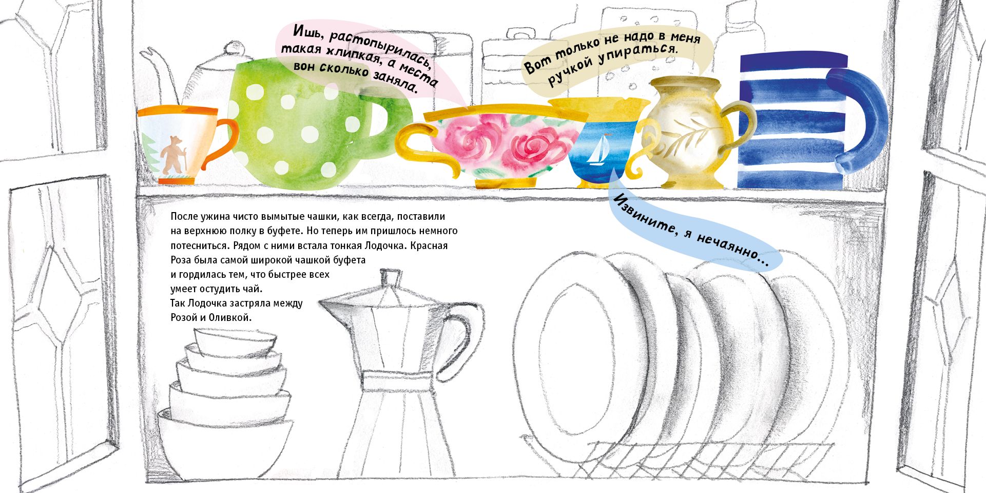 Handling time: 34 days Знаете ли вы, что у каждой чашки есть свои характер и имя? Пока мы не слышим, они ссорятся, мирятся, смеются и плачут. Матроска, Оливка, Зеленый Горох и другие жили на верхней полке буфета как одна семья. Но однажды в доме появилась чашка-лодочка с голубым парусом и красным флажком на мачте. Мама купила ее на блошином рынке. С этого и началась наша история, которая закончится новогодним праздником и прочими чудесами.«Чашка с лодочкой» написана в лучших традициях сказок Х. К. Андерсена: мир вещей оживает и открывает нам свою волшебную сущность.«Когда ты слишком хрупкий, непонятный, чужой и не вписался в компанию — это всегда испытание, особенно для маленького человека. Если вас не принимали в игру, за вашей спиной шептались, если вам было одиноко — вы знаете, каково это. Но так будет не всегда. «Чашка с лодочкой» — это новогодняя сказка, поэтому в ней есть маленькое чудо. Пусть такое чудо случится со всеми, кому это сейчас особенно нужно». Ольга ВасильковаОб авторах:Ольга Василькова — детская писательница и дизайнер, одна из создателей студии Letterhead. Любит объяснять простыми словами сложные вещи, книги, картинки и картины, знает толк в ремонте и красивых пространствах. Татьяна Кормер — художник-иллюстратор, победительница всероссийского конкурса «Образ книги», номинантка Мемориальной премии имени Астрид Линдгрен, соосновательница издательств «Белая ворона» и «Самокат». С ее иллюстрациями в России публиковались книги Астрид Линдгрен, Григория Кружкова, Даниэля Пеннака и многих других.