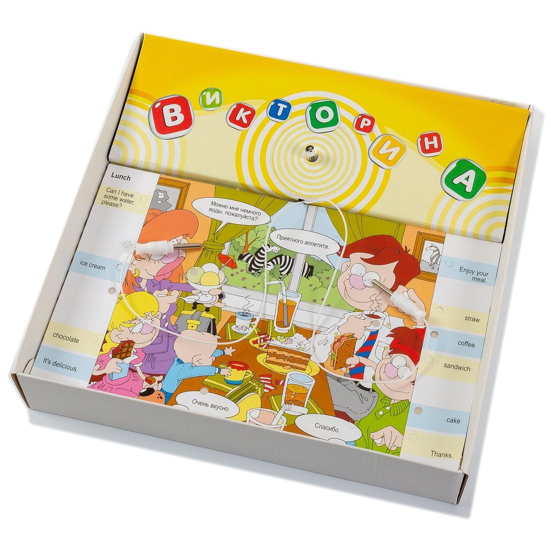 Handling time: 24 days В электровикторине игрок с помощью проводящих ток проводков ищет правильные ответы на вопросы. Один проводок прикладывают рядом с вопросом, а второй - рядом с предполагаемым ответом. Если ответ правильный, электрическая схема замкнётся, загорится лампочка и зазвучит музыка.Ребята узнают более 200 английских слов и 50 выражений. В словарике приведён список использованных английских слов и выражений, английская и русская транскрипции, русский перевод. С одной стороны карточки информация приведена на двух языках - русском и английском. Игрок должен уметь читать по-русски и найти правильный английский перевод. С другой стороны карточки всё написано по-английски и игрок должен постараться понять, что ему нужно делать. Игра поможет ребёнку сделать значительные успехи в освоении английской разговорной речи.Электронная плата, используемая в наших играх, - универсальна. Поэтому, если у вас есть одна электровикторина, то вам не нужно покупать другие игры в коробках, а достаточно приобрести наборы карточек на другие темы.ТЕМЫ КАРТОЧЕК:Утро выходного дняНа детской площадкеОтдых на природеПредставление на водеУ входа в городской паркВ гостях у обезьянЭкзотические животныеКакие бывают животныеЧто умеют делать животныеНазываем части тела животныхЧто мы умеем делатьЧто мы делаем каждый деньПредметы домашнего обиходаСвойства предметовБудьте вежливымиЗабота о здоровьеЛанчВремяОпределяем время по часамВспоминаем предлогиВ комплекте: 10 двусторонних карточек, плата, светозвуковой модуль, батарейки, правила с ответами.Возраст: 7-12 лет.Материал: картон, бумага, пластмасса, металл.Запрещено детям до 3-х лет. Содержит мелкие детали.