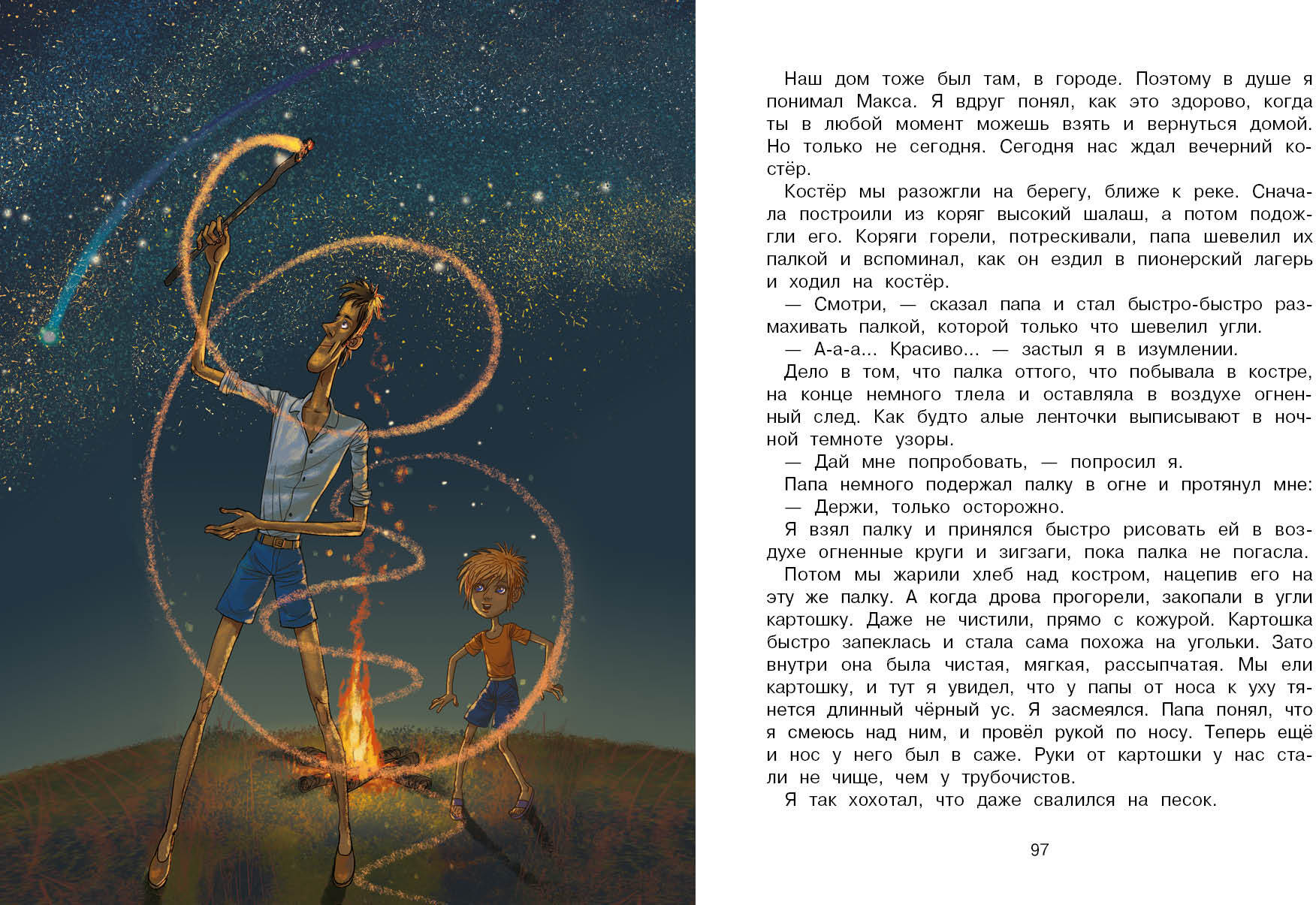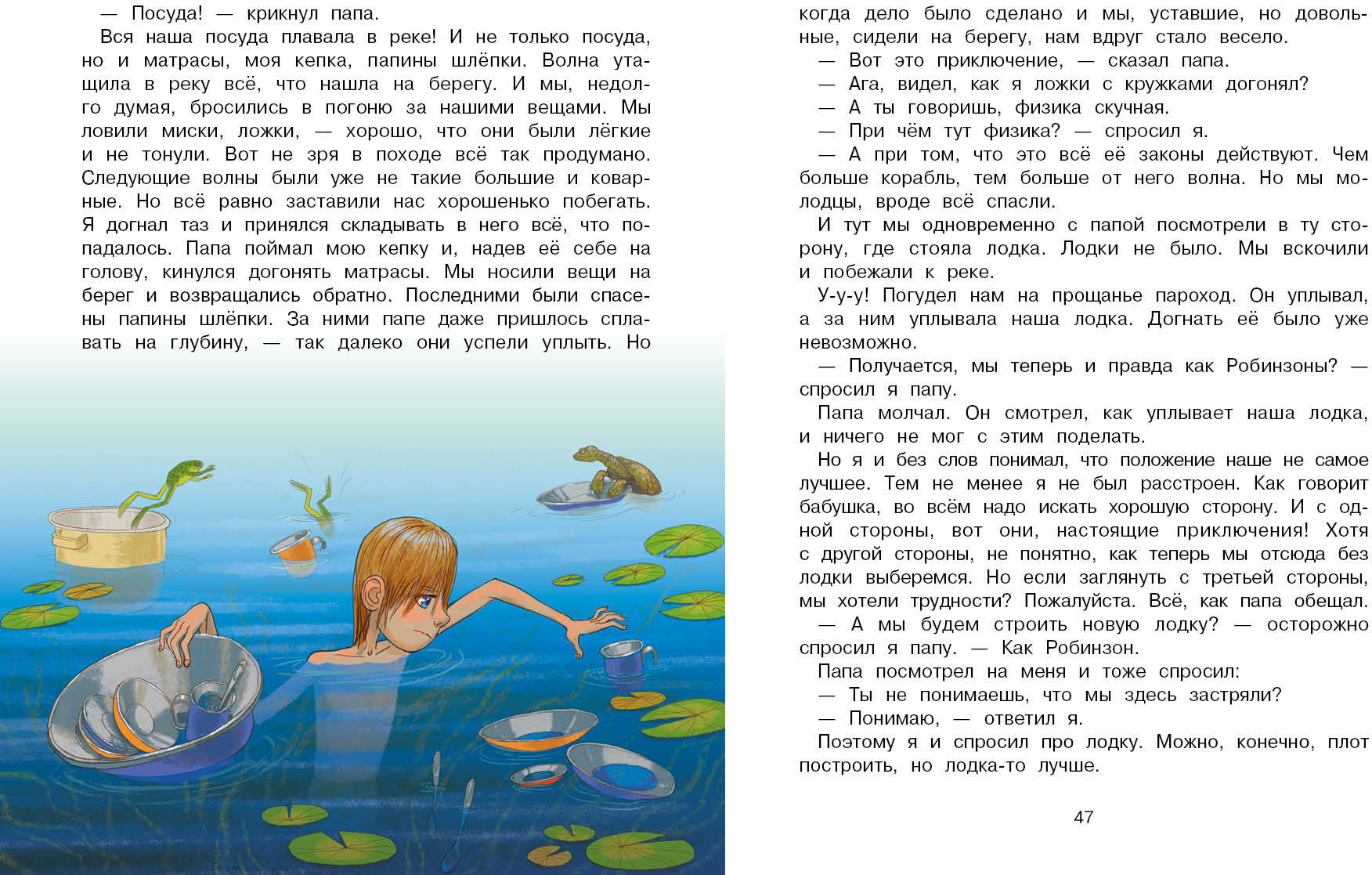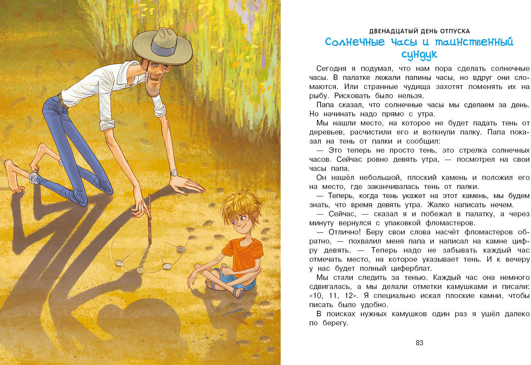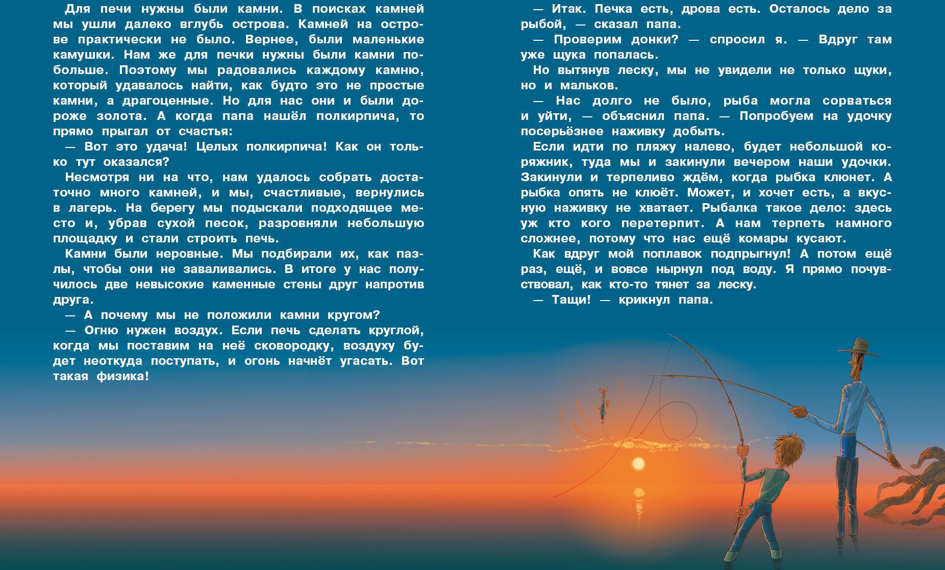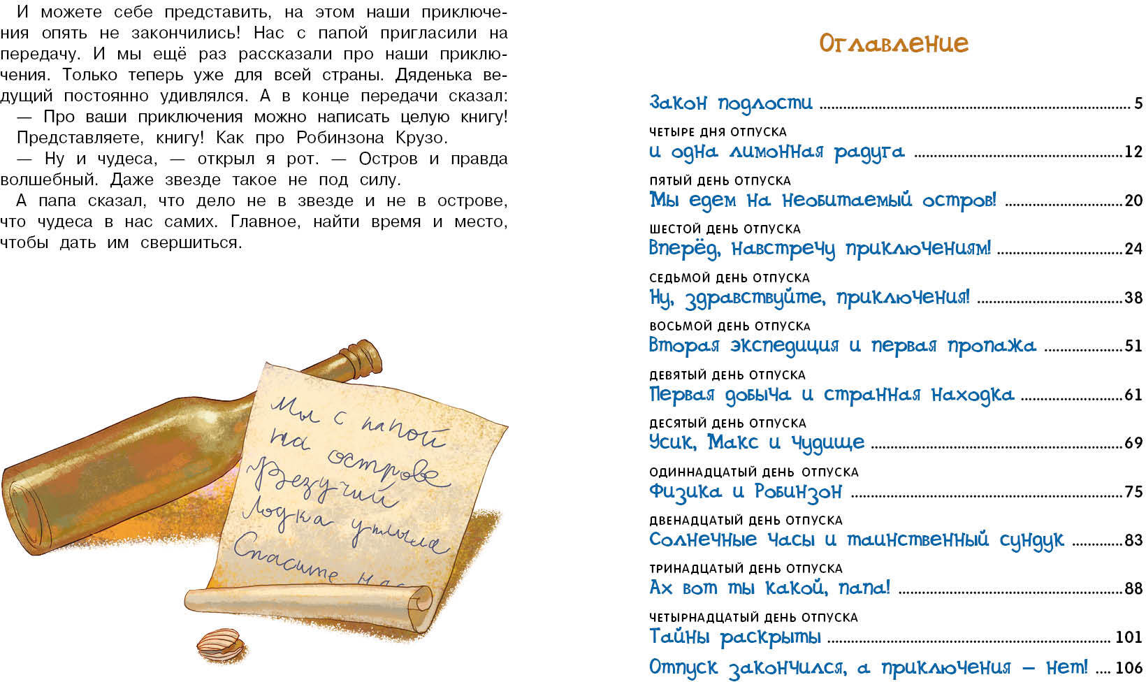 Handling time: 14 days Мой папа все может объяснить законами физики. Но по какому такому закону мы оказались с ним на необитаемом острове – вот загадка так загадка!Сначала папа утопил свой мобильный телефон, потом унесло нашу лодку и мы остались вдвоем на острове, как настоящие Робинзоны! Но папа ничего не боялся, у него же есть я! Это были самые лучшие десять дней в моей жизни! Купания, рыбалка, экспедиции вокруг острова, ночные таинственные гости, загадочные пропажи, индейские танцы у костра и необычные домашние питомцы... И папа наконец-то понял, что все в мире происходит не только по законам физики, и что если загадать желание на падающую звезду, оно обязательно исполнится!Книга для детей дошкольного и младшего школьного возраста.