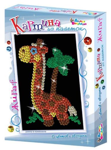 Handling time: 14 days От собственного симпатичного, блестящего во всех смыслах жирафа, созданного для Вас известным художником Андреем Копыриным, Вас отделяют 436 пайеток шести цветов и несколько вечеров интересного, увлекательного занятия. Эта красочная картина создается на плотной черной бумаге, вставленной в рамку размером 26 на 18 сантиметров. По степени сложности вполне подходит для первой попытки собрать картину из пайеток.Эта и множество других картин из паеток, различных по степени сложности можно купить в интернет магазине производителя развивающих игр Десятое Королевство, оформив доставку в любую точку России.