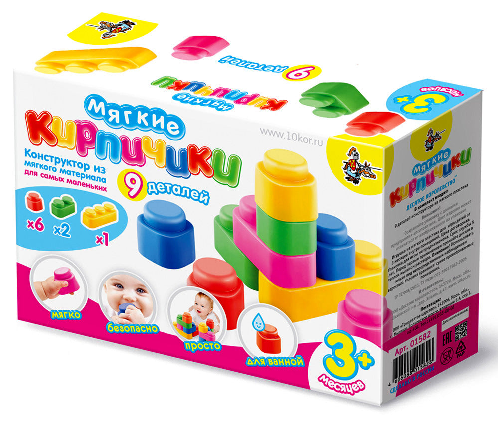 Handling time: 24 days Игрушка из прорезиненного пластика для игры детей от 8 месяцев внутри помещений. Этот красочный мягкий конструктор предназначен специально для самых маленьких детей возрастом от 8 месяцев Из ярких деталей Ваш малыш может построить башенки, домики и другие красочные конструкции. С мягкими кирпичиками можно играть в ванной и в песке. Детали конструктора легко моются. Материал конструктора абсолютно безопасен, даже если захочется попробовать какой-нибудь кирпичик на вкус! Мягкие кирпичики изготовлены из прорезиненного пластика, мягкого и приятного для детских ручек. Детали имеют простую систему скрепления, которую легко освоят даже самые маленькие непоседы! Тренируем воображение. Развиваем тактильные навыки. Учимся распознавать цвета. Развиваем конструкторские способности. В комплект входит: 9 деталей конструктора из прорезиненного пластика. Сделано в России.