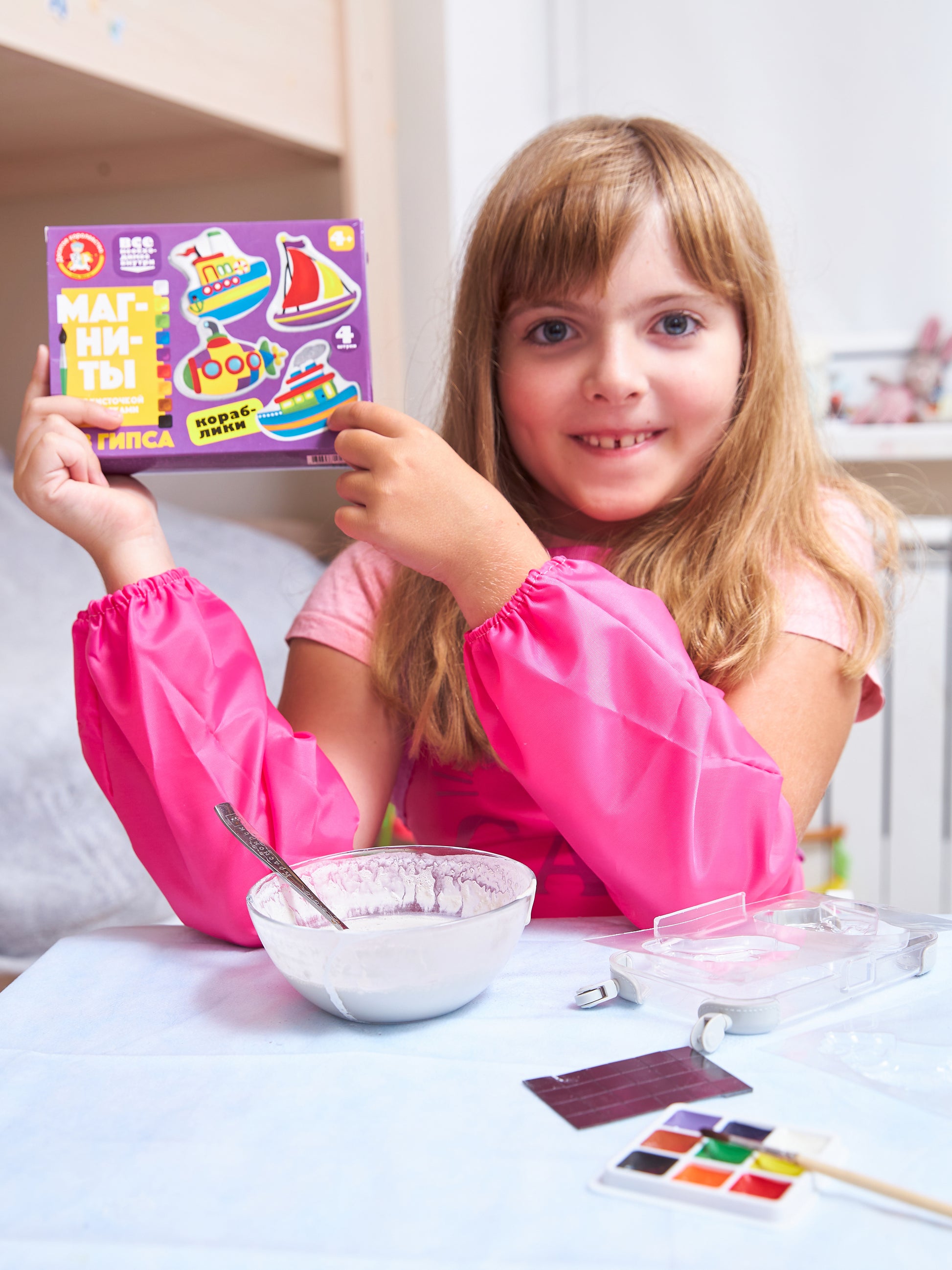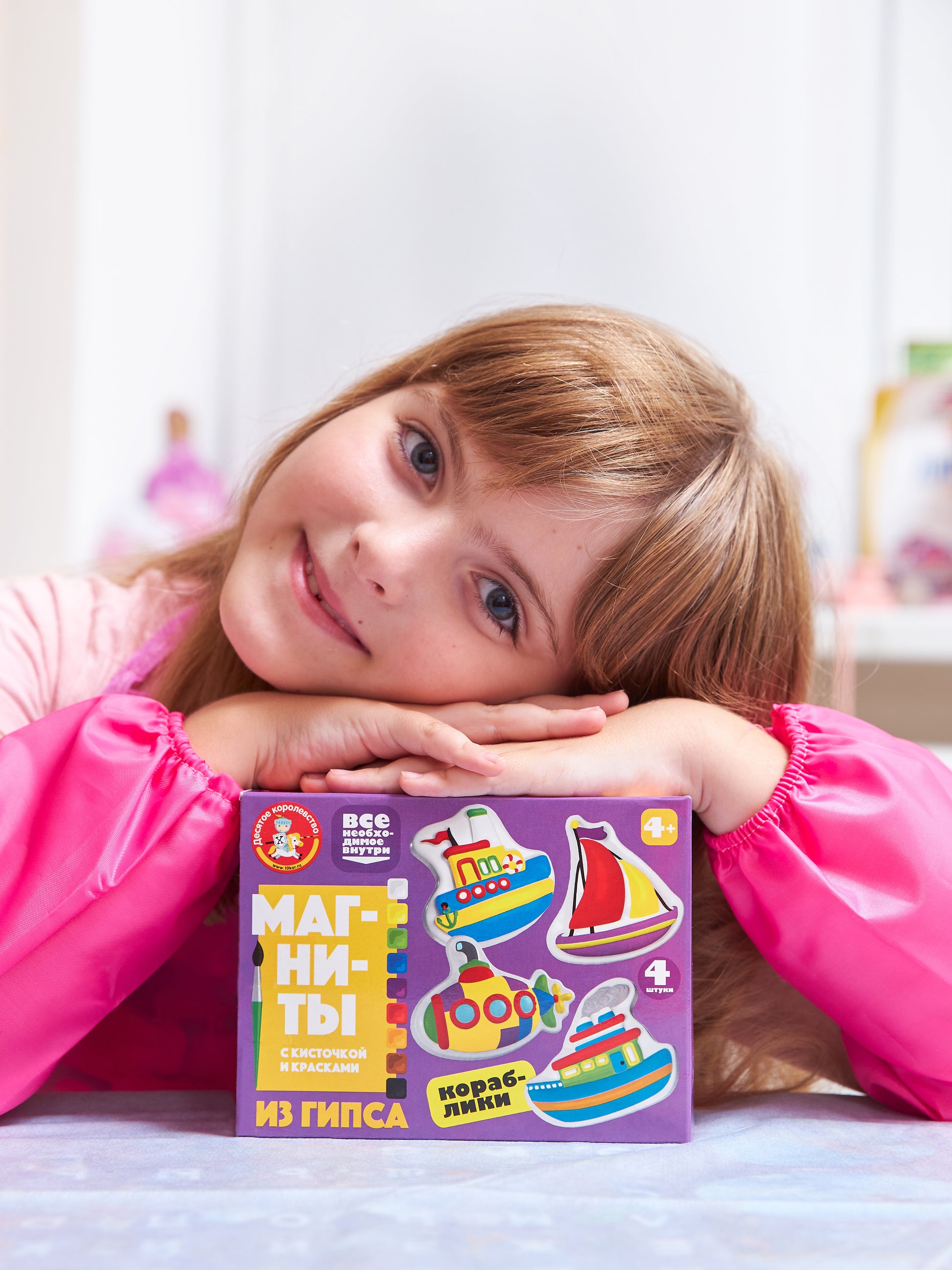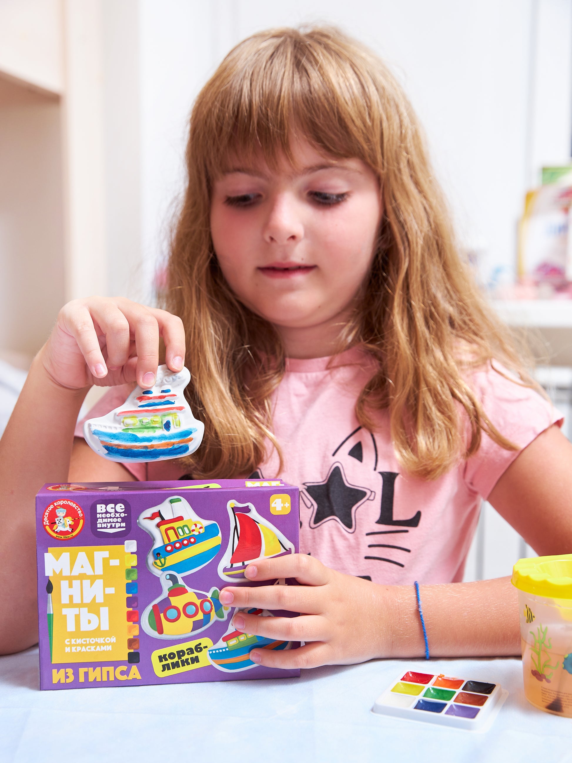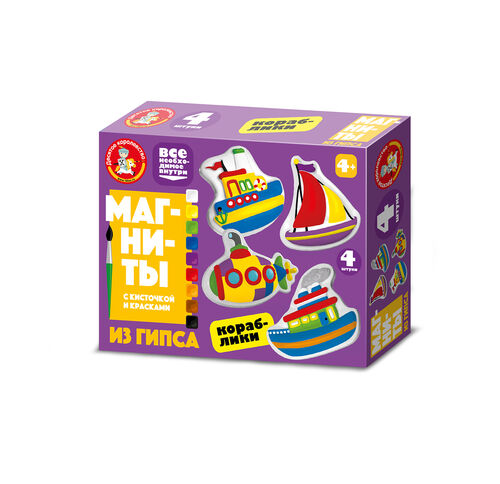 Handling time: 14 days Набор магнитов из гипса под роспись «Кораблик» включает в себя всё необходимое для создания оригинальной поделки своими руками.Помогите ребёнку развести и залить раствор в формочки, следуя пошаговой инструкции. Ребёнок с большим удовольствием примет участие в изготовлении магнитов и с интересом раскрасит готовые фигурки.Состав набора:• гипс – 1 пакет (150 грамм)• формочки для отливки (размер каждого элемента от 5 до 7 см) – 4 шт.• краски – 9 цветов• кисточка – 1 шт.• магнитная лента для крепления фигурок на металлической поверхности• инструкцияНабор предназначен для детей старше 4 лет.Как играть?Вам понадобится удобное рабочее место, которое желательно накрыть газетой или клеенкой. Лучше работать в фартуке или старой одежде, чтобы не бояться испачкаться.Запаситесь ёмкостью, в которой будете смешивать раствор гипса. Это может быть одноразовый стакан, стаканчик из-под йогурта или любая другая ёмкость, которую потом не жалко выбросить.Внимание! Запрещается выливать жидкий гипс в канализацию!