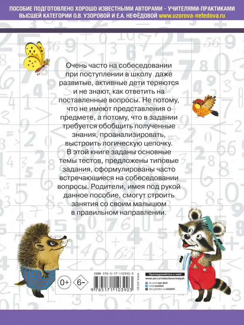 Очень часто на собеседовании при поступлении в школу даже развитые, активные дети теряются и не знают, как ответить на поставленные вопросы. Не потому, что не имеют представления о предмете, а потому что, в задании требуется обобщить полученные знания, проанализировать, выстроить логическую цепочку. В этой книге заданы основные темы тестов, предложены типовые задания, сформулированы наиболее часто встречающиеся на собеседовании вопросы. Родители, имея под рукой данное пособие, смогут строить занятия со своим малышом в правильном направлении.Для дошкольного возраста.Вопросы и задания, предложенные в пособии, помогут родителям и ребёнку подготовиться к поступлению в школу любого уровня. В книге заданы основные темы тестов, предложены типовые задания, сформулированы наиболее частые вопросы, встречающиеся на собеседовании при поступлении в школу. Пособие содержит также упражнения для тренировки руки, которые дошкольник может выполнять по образцу в своей тетради. Начать заниматься с ребёнком по этой книге – значит научить его логическому и образному мышлению, развить память и умение концентрироваться.