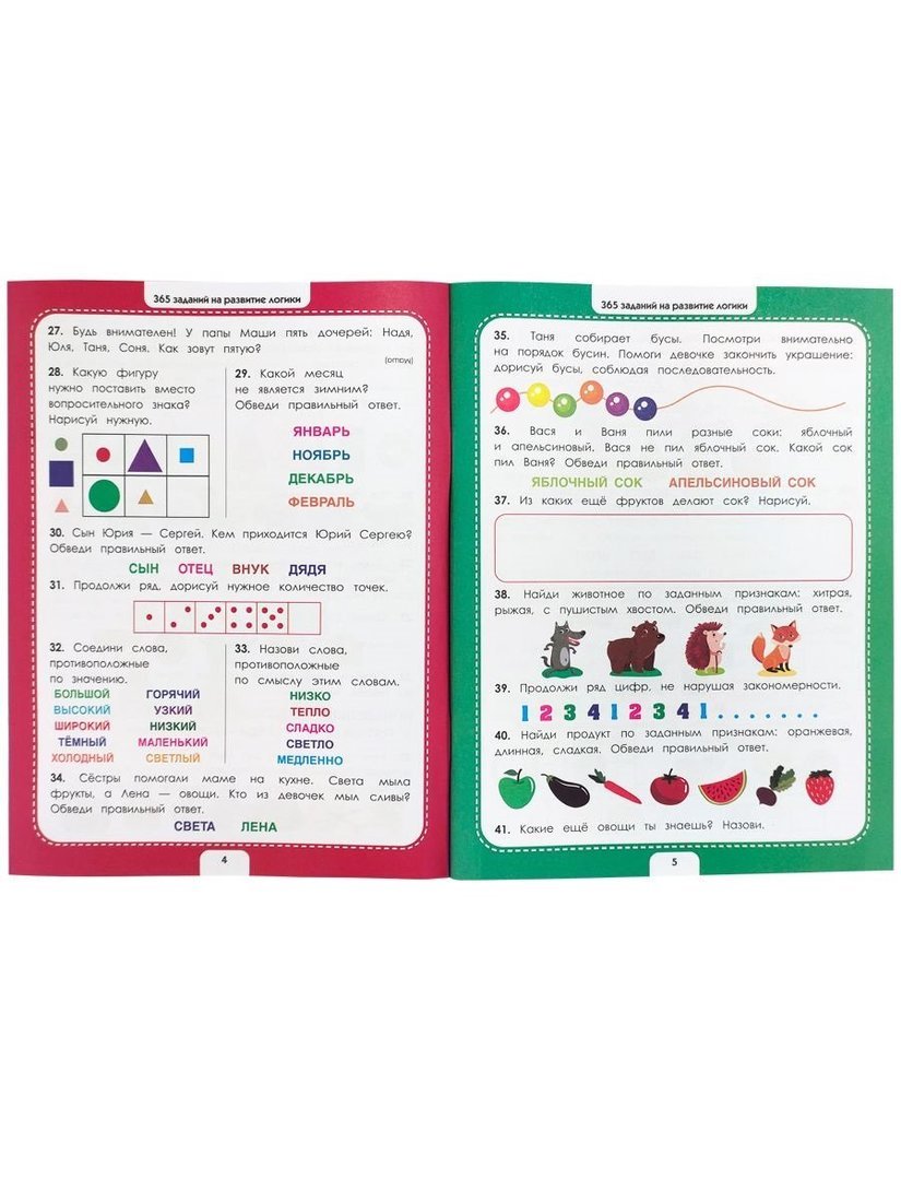 Handling time: 14 days Рабочая тетрадь "Логика" из серии "365 развивающих заданий" – это комплексная подготовка к школе для самых любознательных малышей. Ровно 365 заданий, которые помогут ребёнку освоить понятия формы и размера, научиться строить логические цепочки, определять в них пробелы, соотносить свойства и предметы. Мы специально работали над структурой и оформлением тетради: задания чередуются по сложности и смыслу, страницы оформлены в ярких привлекательных цветах. Мы сделали всё, чтобы ваш ребёнок с удовольствием познавал мир, готовился к школе и развивался. Он будет с радостью возвращаться к занятиям снова!
