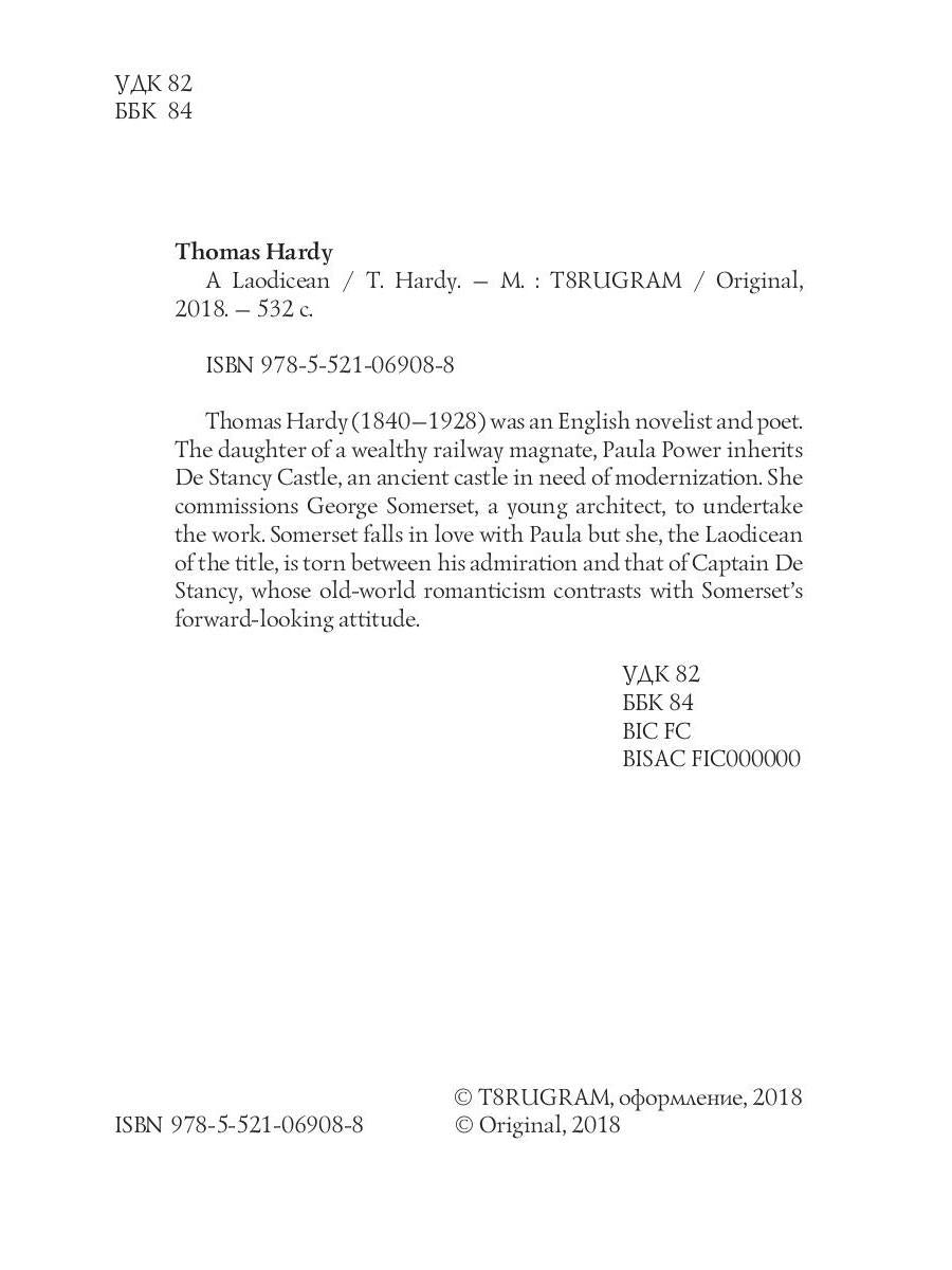 Handling time: 19 days Автор: Hardy T., «A Laodicean = Равнодушная: кн. на англ.яз»: Thomas Hardy (1840—1928) was an English novelist and poet. The daughter of a wealthy railway magnate, Paula Power inherits De Stancy Castle, an ancient castle in need of modernization. She commissions George Somerset, a young architect, to undertake the work. Somerset falls in love with Paula but she, the Laodicean of the title, is torn between his admiration and that of Captain De Stancy, whose old-world romanticism contrasts with Somerset's forward-looking attitude.