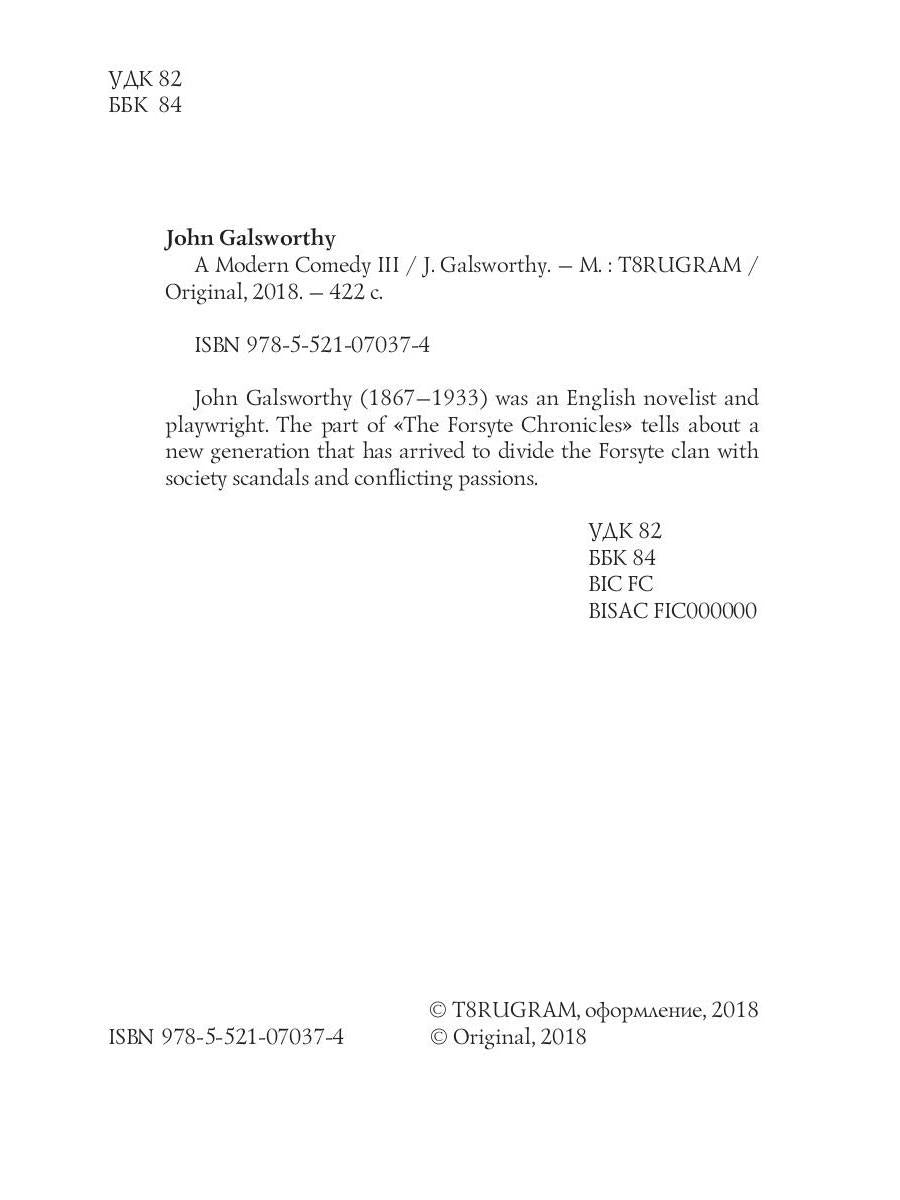 Handling time: 19 days Автор: Galsworthy John, «A Modern Comedy 3 = Современная комедия 3: кн. на англ.яз»: John Galsworthy (1867—1933) was an English novelist and playwright. The part of «The Forsyte Chronicles» tells about a new generation that has arrived to divide the Forsyte clan with society scandals and conflicting passions.