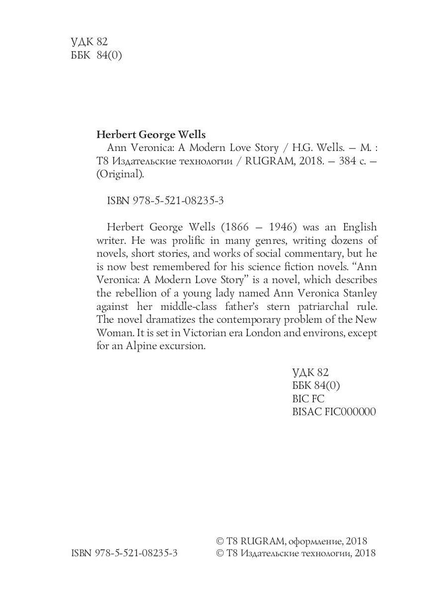 Handling time: 19 days Автор: Wells Herbert George, «Ann Veronica: A Modern Love Story = Анна Вероника: история любви: на англ.яз»: Herbert George Wells (1866 - 1946) was an English writer. He was prolific in many genres, writing dozens of novels, short stories, and works of social commentary, but he is now best remembered for his science fiction novels. "Ann Veronica: A Modern Love Story" is a novel, which describes the rebellion of a young lady named Ann Veronica Stanley against her middle-class father's stern patriarchal rule. The novel dramatizes the contemporary problem of the New Woman. It is set in Victorian era London and environs, except for an Alpine excursion.