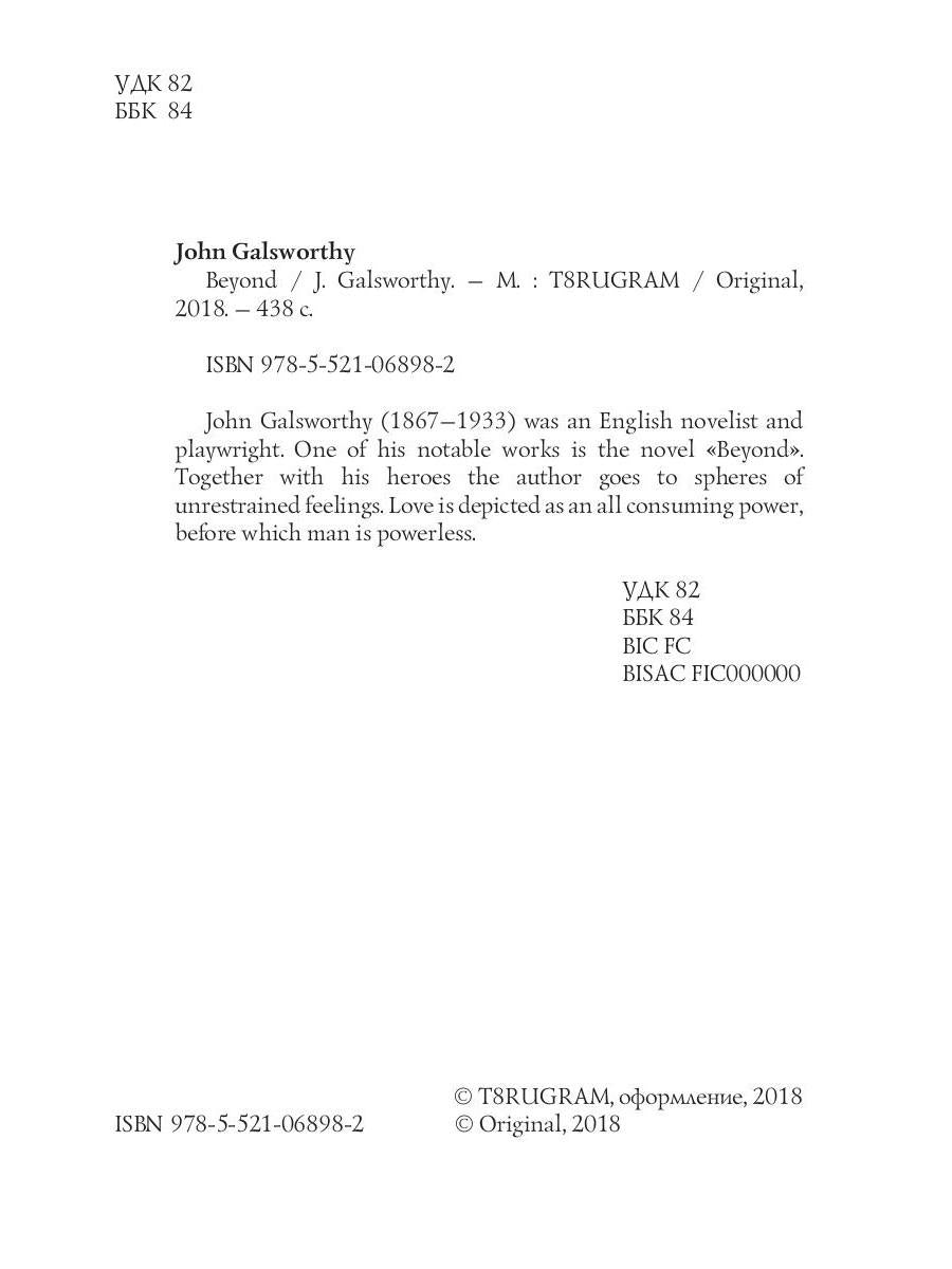 Handling time: 19 days Автор: Galsworthy John, «Beyond = Сильнее смерти: кн. на англ.яз»: John Galsworthy (1867—1933) was an English novelist and playwright. One of his notable works is the novel «Beyond». Together with his heroes the author goes to spheres of unrestrained feelings. Love is depicted as an all consuming power, before which man is powerless.