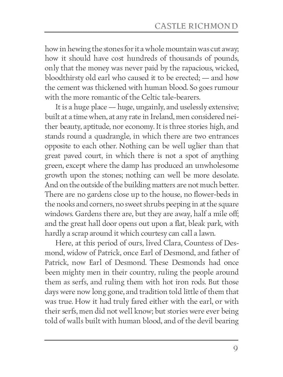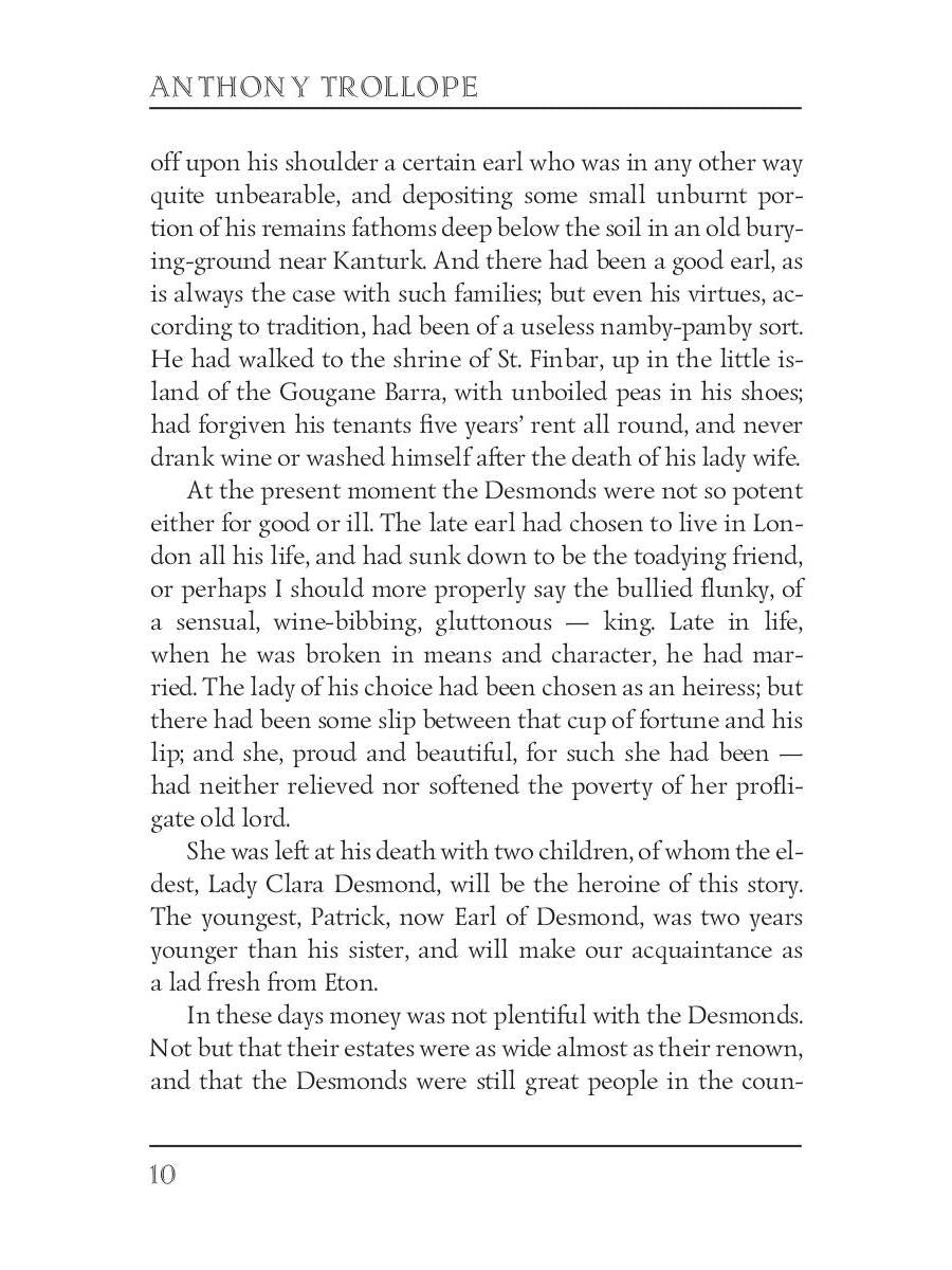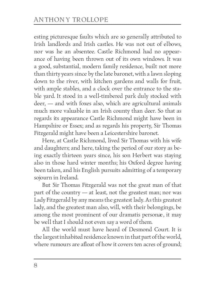 Handling time: 19 days Автор: Trollope A., «Castle Richmond 1»: Anthony Trollope (1815—1882) was an English novelist of the Victorian era. Among his best-known works is a series of novels collectively known as the Chronicles of Barsetshire, which revolves around the imaginary county of Barsetshire. "Castle Richmond" is the third of five Trollope's novels set in Ireland. The plot of the novel features the competition of two Protestant cousins of English origin, Owen Fitzgerald and Herbert Fitzgerald, for the hand of Clara Desmond, the noble but impoverished daughter of the widowed Countess of Desmond