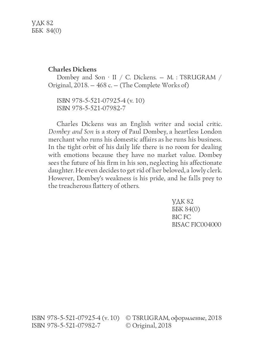 Handling time: 19 days Автор: Dickens Charles, «Dombey and Son 2 = Домби и сын 2: роман на англ.яз»: Charles Dickens was an English writer and social critic. Dombey and Son is a story of Paul Dombey, a heartless London merchant who runs his domestic affairs as he runs his business. In the tight orbit of his daily life there is no room for dealing with emotions because they have no market value. Dombey sees the future of his firm in his son, neglecting his affectionate daughter. He even decides to get rid of her beloved, a lowly clerk. However, Dombey's weakness is his pride, and he falls prey to the treacherous flattery of others.