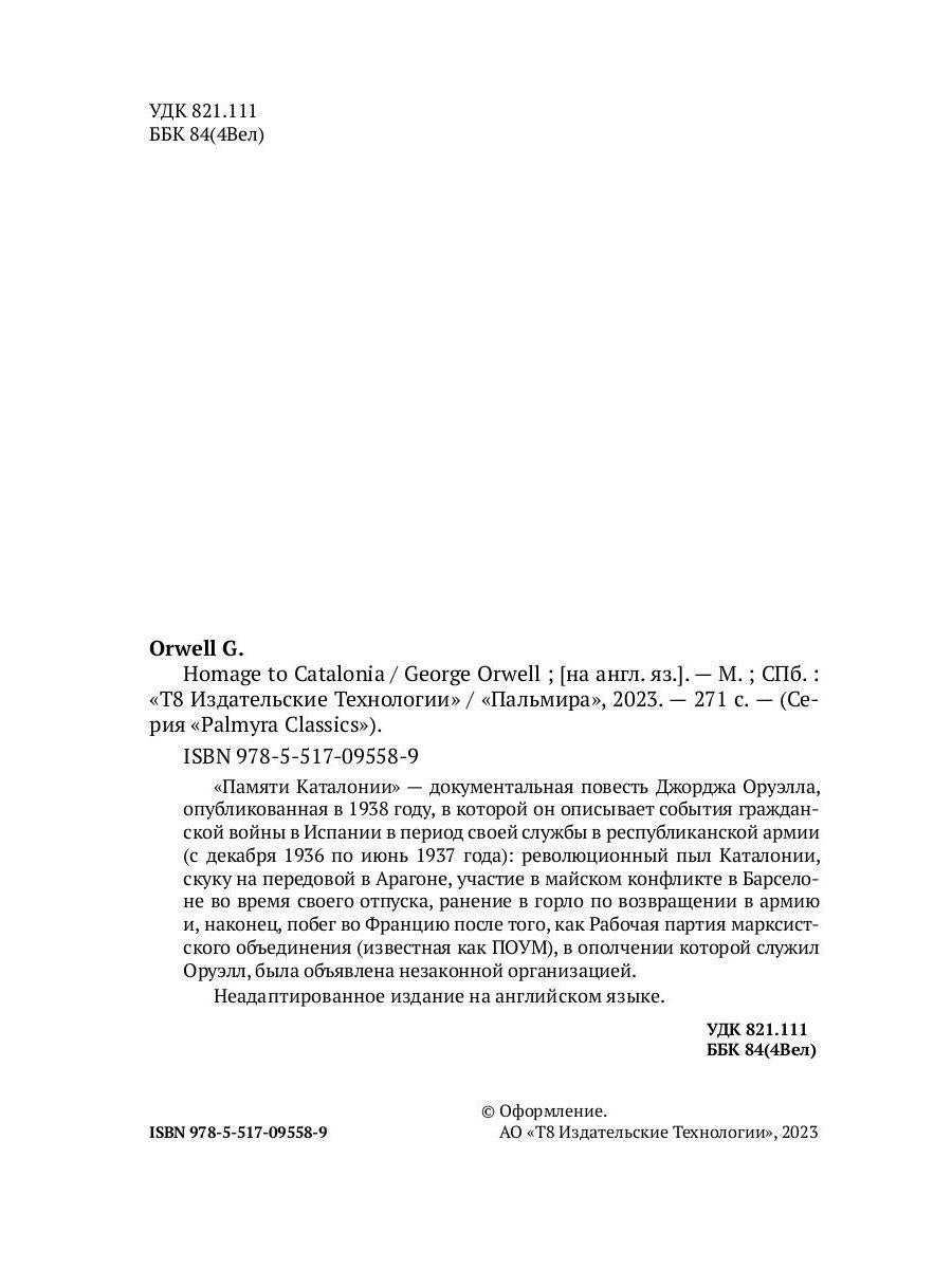 Handling time: 19 days Автор: Оруэлл Дж., «Homage to Catalonia»: "Памяти Каталонии" - документальная повесть Джорджа Оруэлла, опубликованная в 1938 году, в которой он описывает события гражданской войны в Испании в период своей службы в республиканской армии (с декабря 1936 по июнь 1937 года): революционный пыл Каталонии, скуку на передовой в Арагоне, участие в майском конфликте в Барселоне во время своего отпуска, ранение в горло по возвращении в армию и, наконец, побег во Францию после того, как Рабочая партия марксистского объединения (известная как ПОУМ), в ополчении которой служил Оруэлл, была объявлена незаконной организацией. Неадаптированное издание на английском языке.