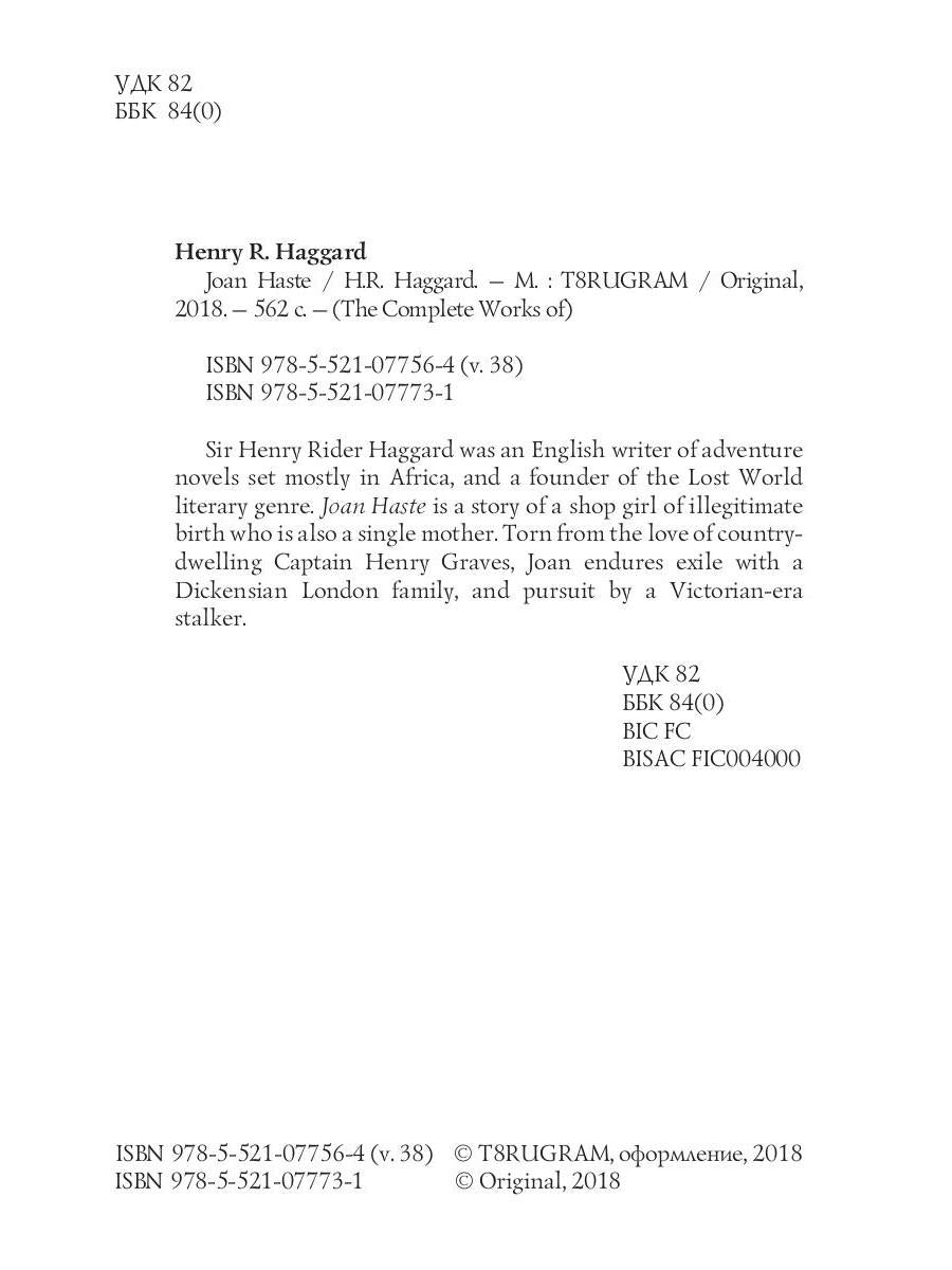 Handling time: 19 days Автор: Haggard H.R., «Joan Haste = Джоан Уэст. Т. 38.: на англ.яз»: Sir Henry Rider Haggard was an English writer of adventure novels set mostly in Africa, and a founder of the Lost World literary genre. Joan Haste is a story of a shop girl of illegitimate birth who is also a single mother. Torn from the love of country-dwelling Captain Henry Graves, Joan endures exile with a Dickensian London family, and pursuit by a Victorian-era stalker.