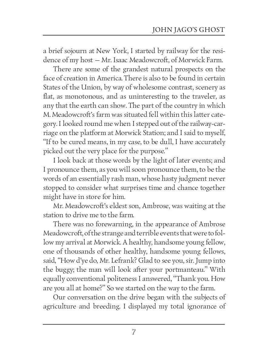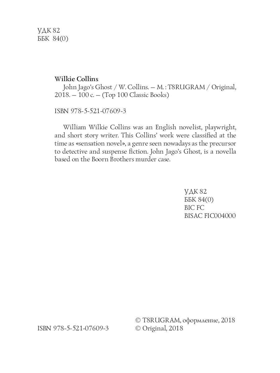 Handling time: 19 days Автор: Collins William Wilkie, «John Jago's Ghost = Призрак Джона Джаго (на английском языке)»: William Willcie Collins was an English novelist, playwright, and short story writer. This Collins' work were classified at the time as «sensation novel», a genre seen nowadays as the precursor to detective and suspense fiction. John Jago's Ghost, is a novella based on the Boorn Brothers murder case.