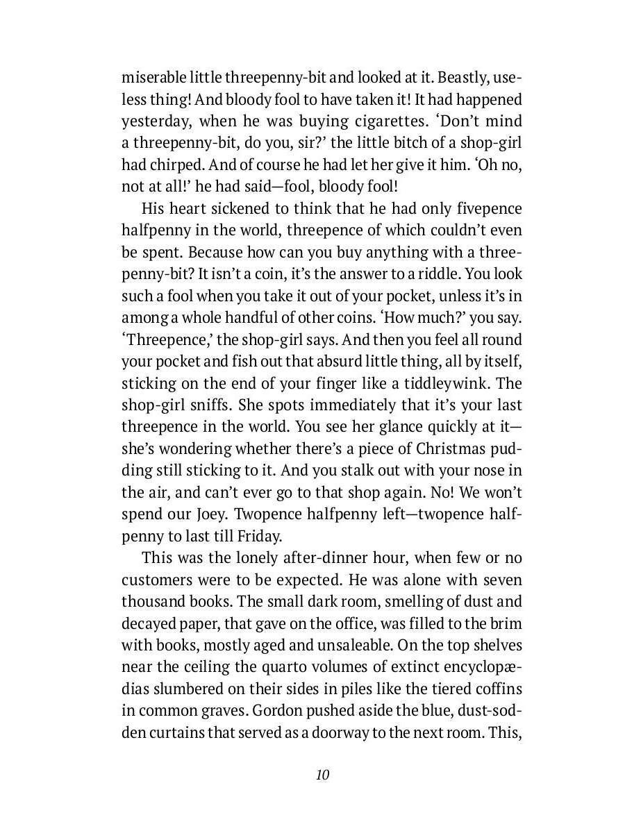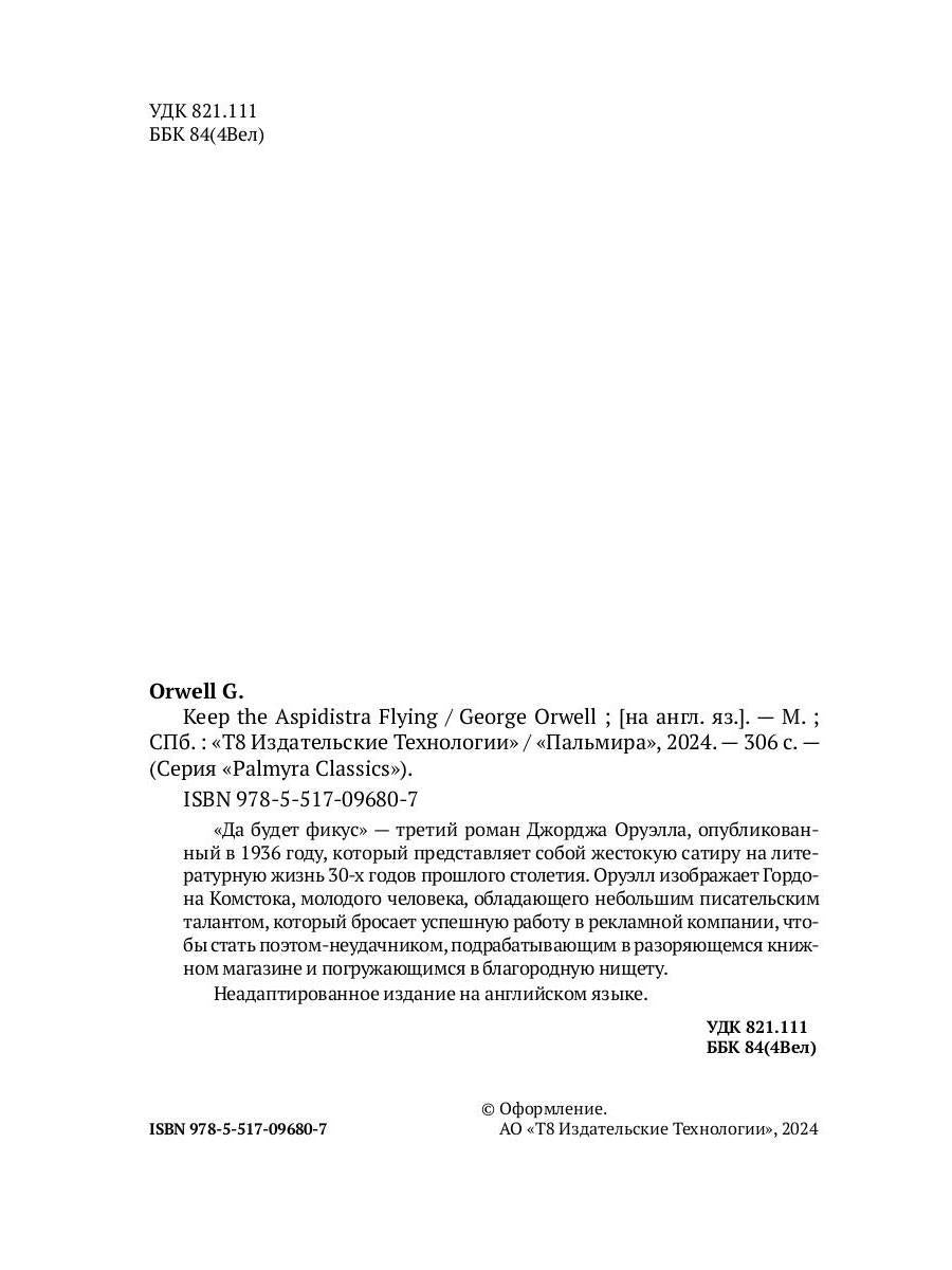 Handling time: 19 days Автор: Оруэлл Дж., «Keep the Aspidistra Flying: на англ.яз»: "Да будет фикус" - третий роман Джорджа Оруэлла, опубликованный в 1936 году, который представляет собой жестокую сатиру на литературную жизнь 30-х годов прошлого столетия. Оруэлл изображает Гордона Комстока, молодого человека, обладающего небольшим писательским талантом, который бросает успешную работу в рекламной компании, чтобы стать поэтом-неудачником,подрабатывающим в разоряющемся книжном магазине и погружающимся в благородную нищету. Неадаптированное издание на английском языке.
