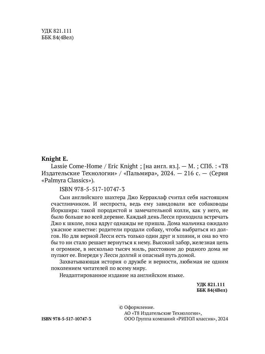 Handling time: 19 days Автор: Найт Эрик, «Lassie Come-Home: на англ.яз»: Сын английского шахтера Джо Керраклаф считал себя настоящим счастливчиком. И неспроста, ведь ему завидовали все собаководы Йоркшира: такой породистой и замечательной колли, как у него, не было больше во всей деревне. Каждый день Лесси приходила встречать Джо к школе, пока вдруг однажды не пришла. Дома мальчика ожидало ужасное известие: родители продали собаку, чтобы выбраться из долгов. Но для верной Лесси есть только один друг и хозяин, и она во что бы то ни стало решает вернуться к нему. Высокий забор, железная цепь и огромное, в несколько тысяч миль, расстояние до родного дома не пугают ее. Впереди у Лесси долгий и опасный путь домой. Захватывающая история о дружбе и верности, любимая не одним поколением читателей по всему миру. Неадаптированное издание на английском языке.