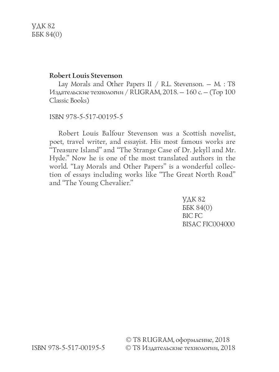Handling time: 19 days Автор: Stevenson Robert Louis Balfour, «Lay Morals and Other Papers II. Коллекция эссе (на английском языке)»: Robert Louis Balfour Stevenson was a Scottish novelist, poet, travel writer, and essayist. His most famous works are "Treasure Island" and "The Strange Case of Dr. Jekyll and Mr. Hyde." Now he is one of the most translated authors in the world. "Lay Morals and Other Papers" is a wonderful collection of essays including works like "The Great North Road" and "The Young Chevalier."
