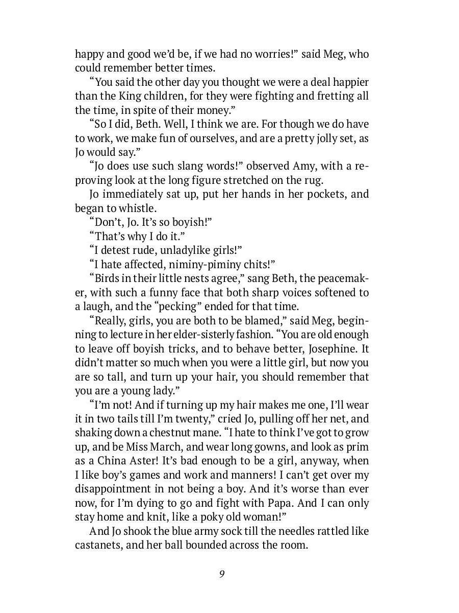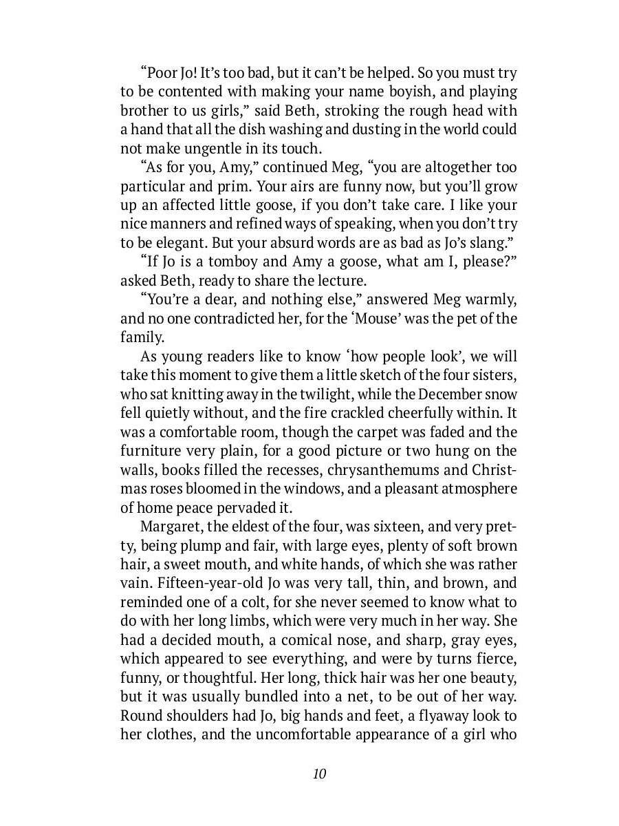 В живописной американской провинции XIX столетия четыре сестры — добросердечная Мэг, сорванец в юбке Джо, хрупкая Бесс и романтичная Эми — берут на себя заботы по дому, когда их отец уходит на войну полковым священником. Проходят дни, полнящиеся своими радостями и горестями, трогательными мечтами и трудными решениями, мучительным ожиданием известий с фронта. Взросление оказывается совсем не простым испытанием, но сестры обретают поддержку в своей мудрой любимой маме и, конечно, друг в друге, сколь бы разными они ни были. Преодолевая сообща трудности, они учатся быть смелыми и честными, ценить дружбу и преданность. По выходе романа в 1868–1869 годах читатели мгновенно влюбились в этих «маленьких женщин». Трогательный, исполненный тонких чувств и задумчивых прозрений, роман стал признанной классикой американской литературы и сегодня читается с неподдельным интересом, ведь каждый из нас однажды проходит свой непростой путь взросления.
