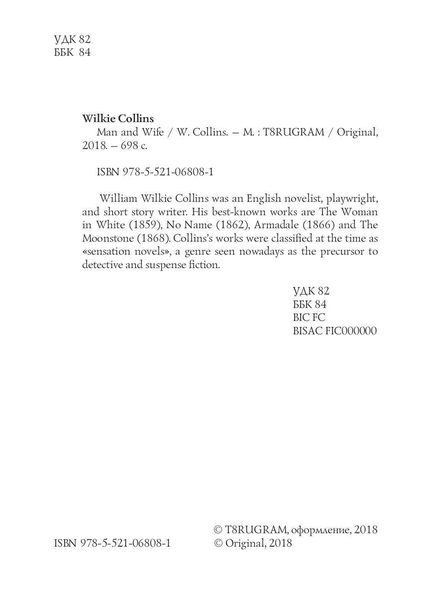 Handling time: 19 days Автор: Collins William Wilkie, «Man and Wife = Муж и жена (на английском языке)»: William Wilkie Collins was an English novelist, playwright, and short story writer. His best-known works are The Woman in White (1859), No Name (1862), Armadale (1866) and The Moonstone (1868). Collins's works were classified at the time as «sensation novels», a genre seen nowadays as the precursor to detective and suspense fiction.