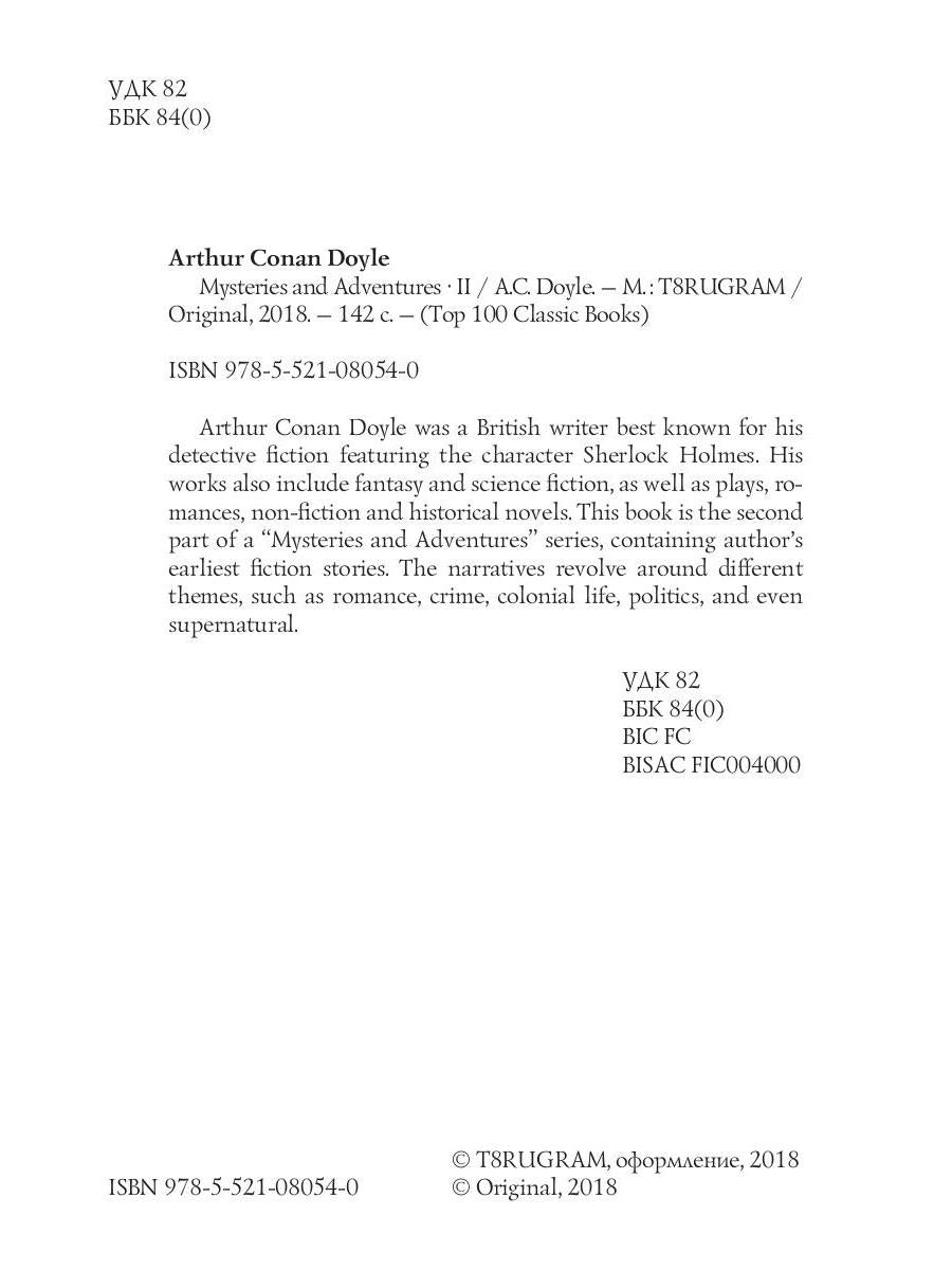 Handling time: 19 days Автор: Doyle Arthur Conan, «Mysteries and Adventures 2 = Тайны и Приключения 2: на англ.яз»: Arthur Conan Doyle was a British writer best known for his detective fiction featuring the character Sherlock Holmes. His works also include fantasy and science fiction, as well as plays, romances, non-fiction and historical novels. This book is the second part of a "Mysteries and Adventures" series, containing author's earliest fiction stories. The narratives revolve around different themes, such as romance, crime, colonial life, politics, and even supernatural.