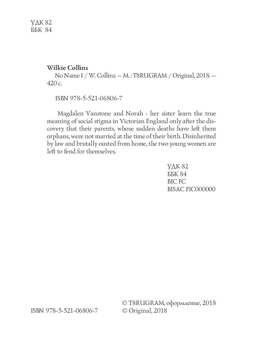 Handling time: 19 days Автор: Collins William Wilkie, «No Name I = Без Имени 1 (на английском языке)»: Magdalen Vanstone and Norah - her sister learn the true meaning of social stigma in Victorian England only after the discovery that their parents, whose sudden deaths have left them orphans, were not married at the time of their birth. Disinherited by law and brutally ousted from home, the two young women are left to fend for themselves.