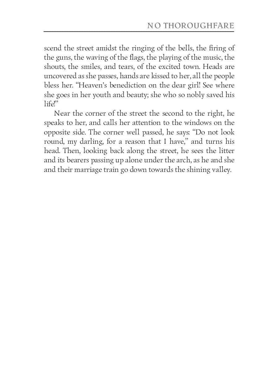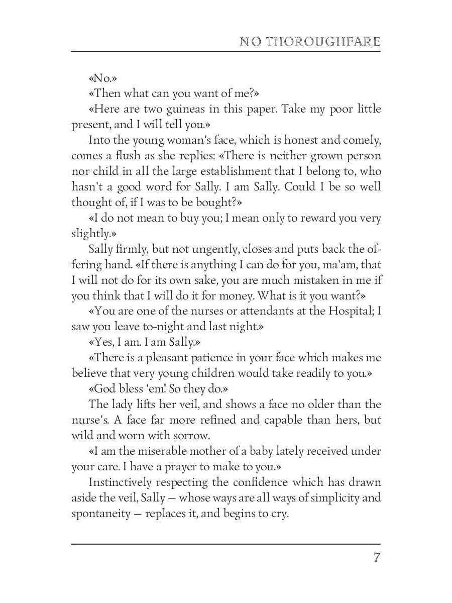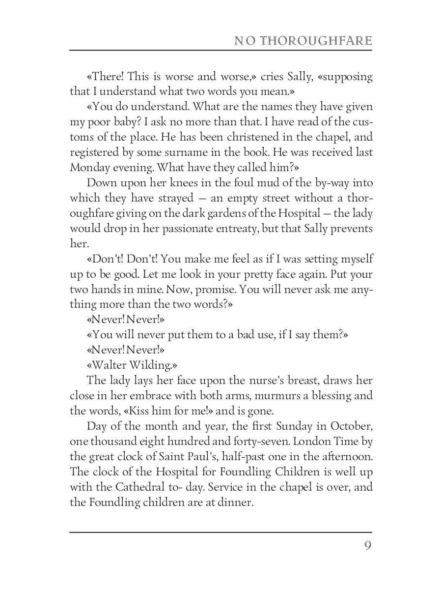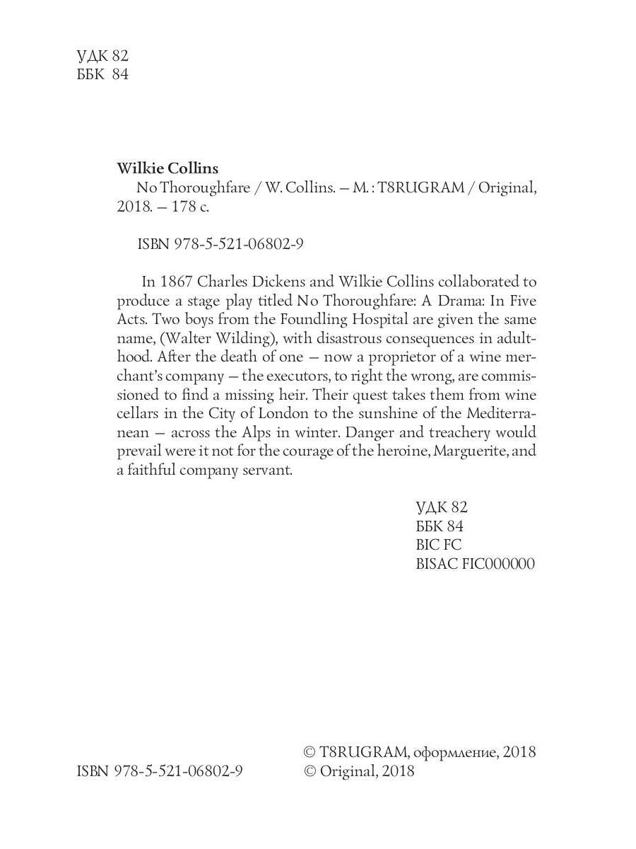 Handling time: 19 days Автор: Collins William Wilkie, «No Thoroughfare = В тупике (роман на английском языке)»: In 1867 Charles Dickens and Wilkie Collins collaborated to produce a stage play titled No Thoroughfare: A Drama: In Five Acts. Two boys from the Foundling Hospital are given the same name, (Walter Wilding), with disastrous consequences in adulthood. After the death of one - now a proprietor of a wine merchant's company - the executors, to right the wrong, are commissioned to find a missing heir. Their quest takes them from wine cellars in the City of London to the sunshine of the Mediterranean - across the Alps in winter. Danger and treachery would prevail were it not for the courage of the heroine, Marguerite, and a faithful company servant.