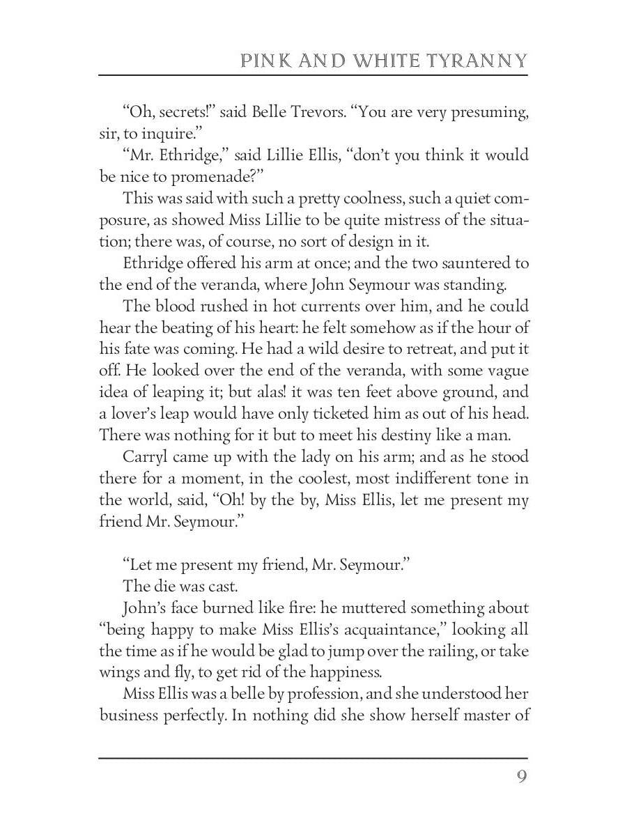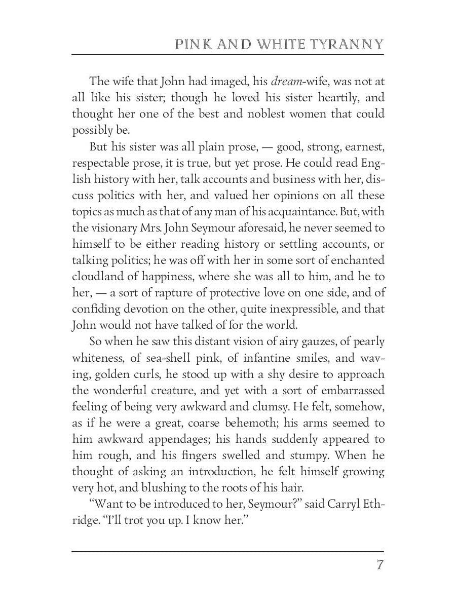 Handling time: 19 days Автор: Stowe H., «Pink and White Tyranny = Бело-розовая тирания: на англ.яз»: Harriet Beecher Stowe (1811 — 1896) was an American abolitionist and author. She is best known for her novel "Uncle Tom's Cabin," which depicts the harsh conditions for enslaved African Americans. "Pink and White Tyranny" is a comedy of manners on the institution of marriage in the nineteenth century. The main character, Lillie Ellis, has been spoiled, petted, and flattered since the day she was born. When she tricks the adoring and upright John Seymour into marriage, it is unclear who is the victim and who is the victimizer.