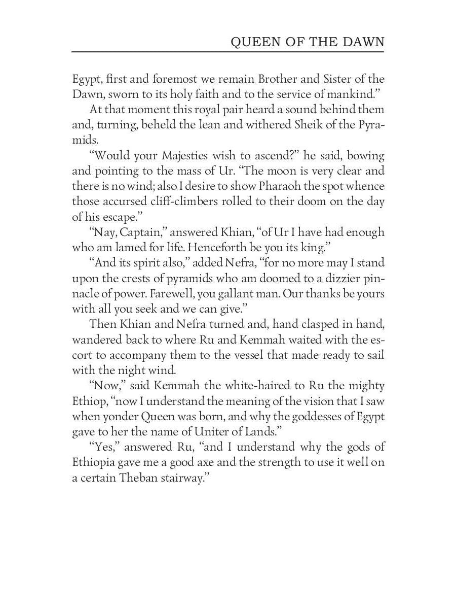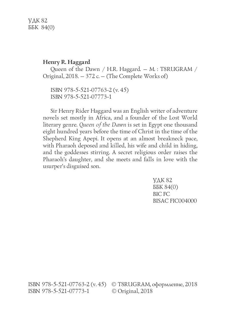 Handling time: 19 days Автор: Haggard H.R., «Queen of the Dawn = Владычица Зари: на англ.яз»: Sir Henry Rider Haggard was an English writer of adventure novels set mostly in Africa, and a founder of the Lost World literary genre. Queen of the Dawn is set in Egypt one thousand eight hundred years before the time of Christ in the time of the Shepherd King Apepi. It opens at an almost breakneck pace, with Pharaoh deposed and killed, his wife and child in hiding, and the goddesses stirring. A secret religious order raises the Pharaoh's daughter, and she meets and falls in love with the usurper's disguised son.