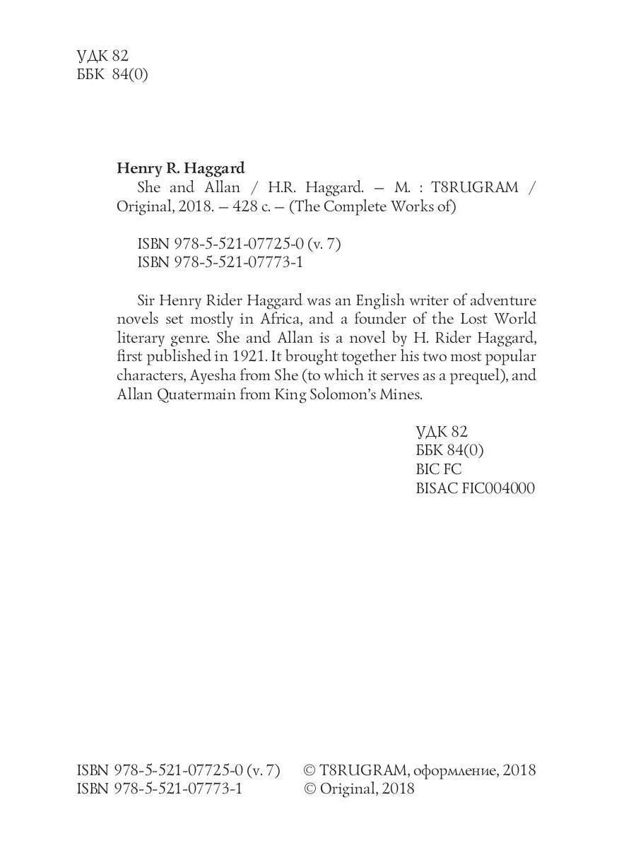 Handling time: 19 days Автор: Haggard H.R., «She and Allan = Она и Аллан: на англ.яз»: Sir Henry Rider Haggard was an English writer of adventure novels set mostly in Africa, and a founder of the Lost World literary genre. She and Allan is a novel by H. Rider Haggard, first published in 1921. It brought together his two most popular characters, Ayesha from She (to which it serves as a prequel), and Allan Quatermain from King Solomon's Mines.