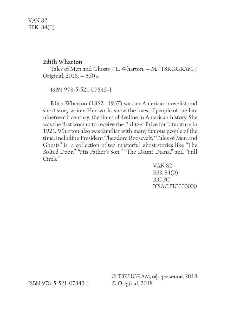 Handling time: 19 days Автор: Wharton Edith, «Tales of Men and Ghosts = Рассказы о людях и призраках: на англ.яз»: Edith Wharton (1862—1937) was an American novelist and short story writer. Her works show the lives of people of the late nineteenth century, the times of decline in American history. She was the first woman to receive the Pulitzer Prize for Literature in 1921. Wharton also was familiar with many famous people of the time, including President Theodore Roosevelt. "Tales of Men and Ghosts" is a collection of ten masterful ghost stories like "The Bolted Door," "His Father's Son," "The Daunt Diana," and "Full Circle."