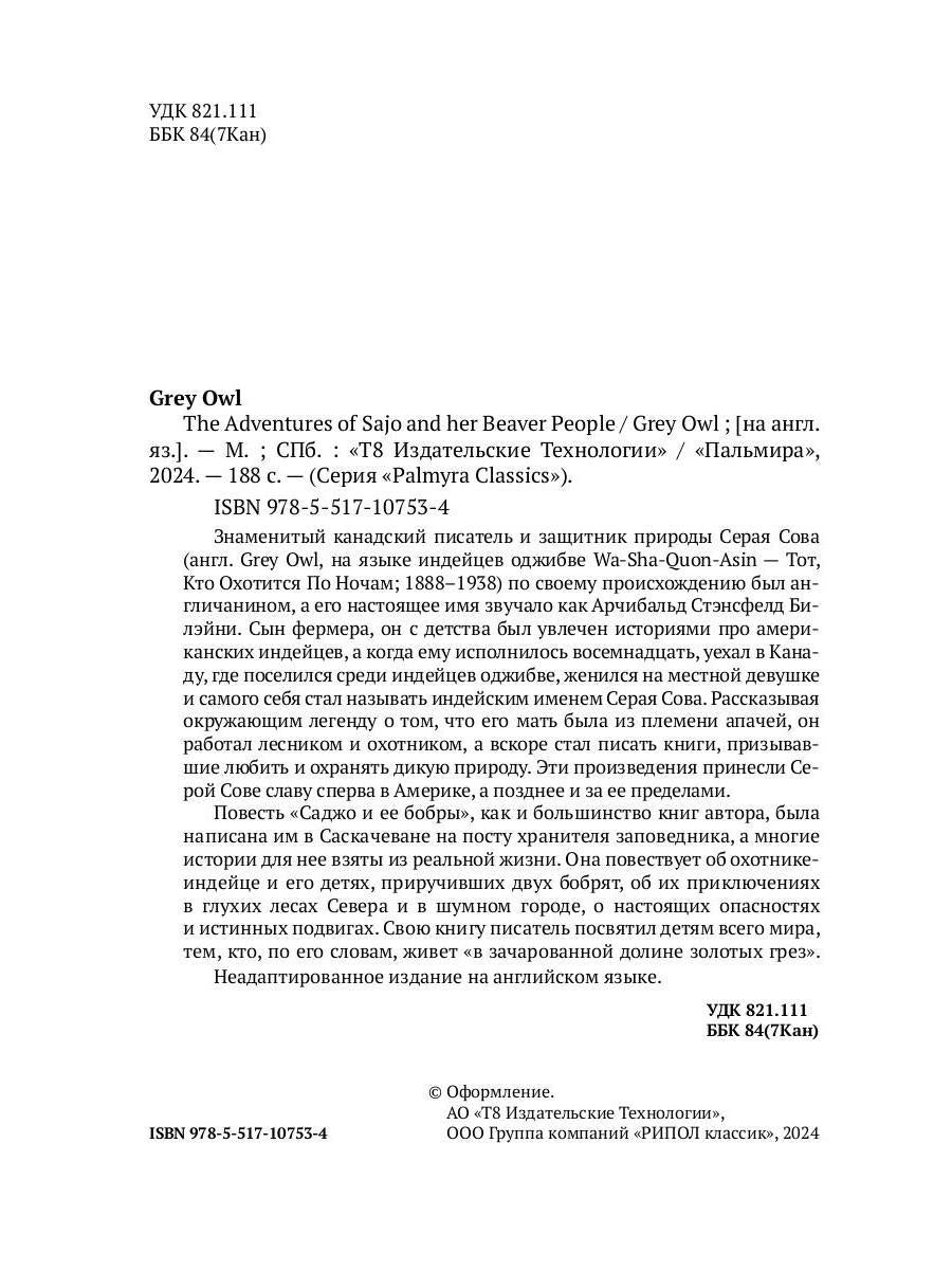 Handling time: 19 days Автор: Серая Сова, «The Adventures of Sajo and Her Beaver People: на англ.яз»: Знаменитый канадский писатель и защитник природы Серая Сова (англ. Grey Owl, на языке индейцев оджибве Wa-Sha-Quon-Asin - Тот, Кто Охотится По Ночам; 1888–1938) по своему происхождению был англичанином, а его настоящее имя звучало как Арчибальд Стэнсфелд Билэйни. Сын фермера, он с детства был увлечен историями про американских индейцев, а когда ему исполнилось восемнадцать, уехал в Канаду, где поселился среди индейцев оджибве, женился на местной девушке и самого себя стал называть индейским именем Серая Сова. Рассказывая окружающим легенду о том, что его мать была из племени апачей, он работал лесником и охотником, а вскоре стал писать книги, призывавшие любить и охранять дикую природу. Эти произведения принесли Серой Сове славу сперва в Америке, а позднее и за ее пределами. Повесть «Саджо и ее бобры», как и большинство книг автора, была написана им в Саскачеване на посту хранителя заповедника, а многие истории для нее взяты из реальной жизни. Она повествует об охотнике-индейце и его детях, приручивших двух бобрят, об их приключениях в глухих лесах Севера и в шумном городе, о настоящих опасностях и истинных подвигах. Свою книгу писатель посвятил детям всего мира, тем, кто, по его словам, живет «в зачарованной долине золотых грез». Неадаптированное издание на английском языке.