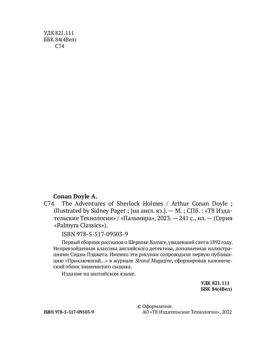 Handling time: 19 days Автор: Дойл Артур Конан, «The Adventures of Sherlock Holmes»: Первый сборник рассказов о Шерлоке Холмсе, увидевший свет в 1892 году. Непревзойденная классика английского детектива, дополненная иллюстрациями Сидни Пэджета. Именно эти рисунки сопроводили первую публикацию "Приключений…" в журнале Strand Magazine, сформировав канонический облик знаменитого сыщика. Издание на английском языке.