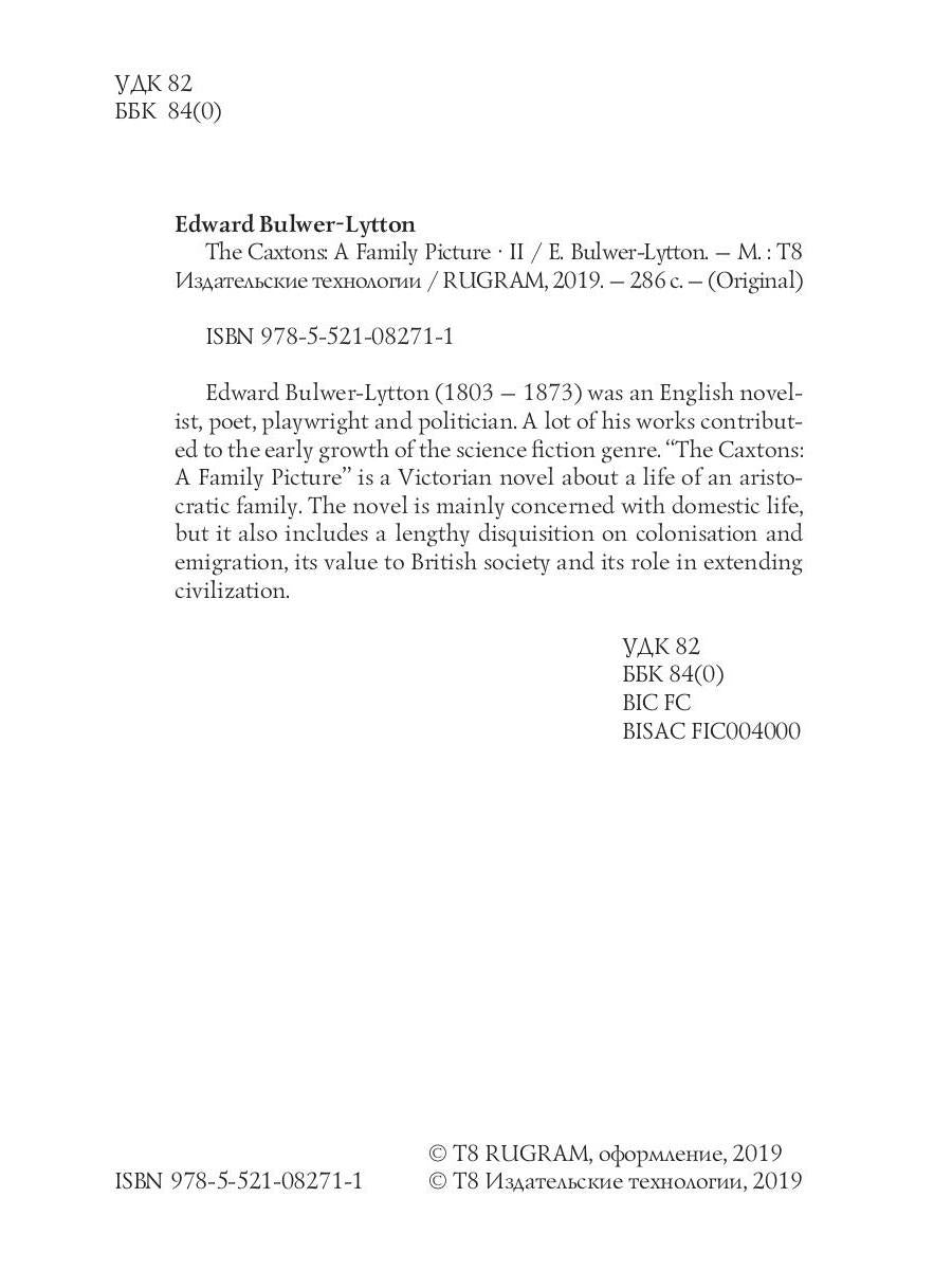 Handling time: 19 days Автор: Bulwer-Lytton E., «The Caxtons: A Family Picture 2 = Семейство Какстон 2: на англ.яз»: Edward Bulwer-Lytton (1803 — 1873) was an English novelist, poet, playwright and politician. A lot of his works contributed to the early growth of the science fiction genre. "The Caxtons: A Family Picture" is a Victorian novel about a life of an aristocratic family. The novel is mainly concerned with domestic life, but it also includes a lengthy disquisition on colonisation and emigration, its value to British society and its role in extending civilization.
