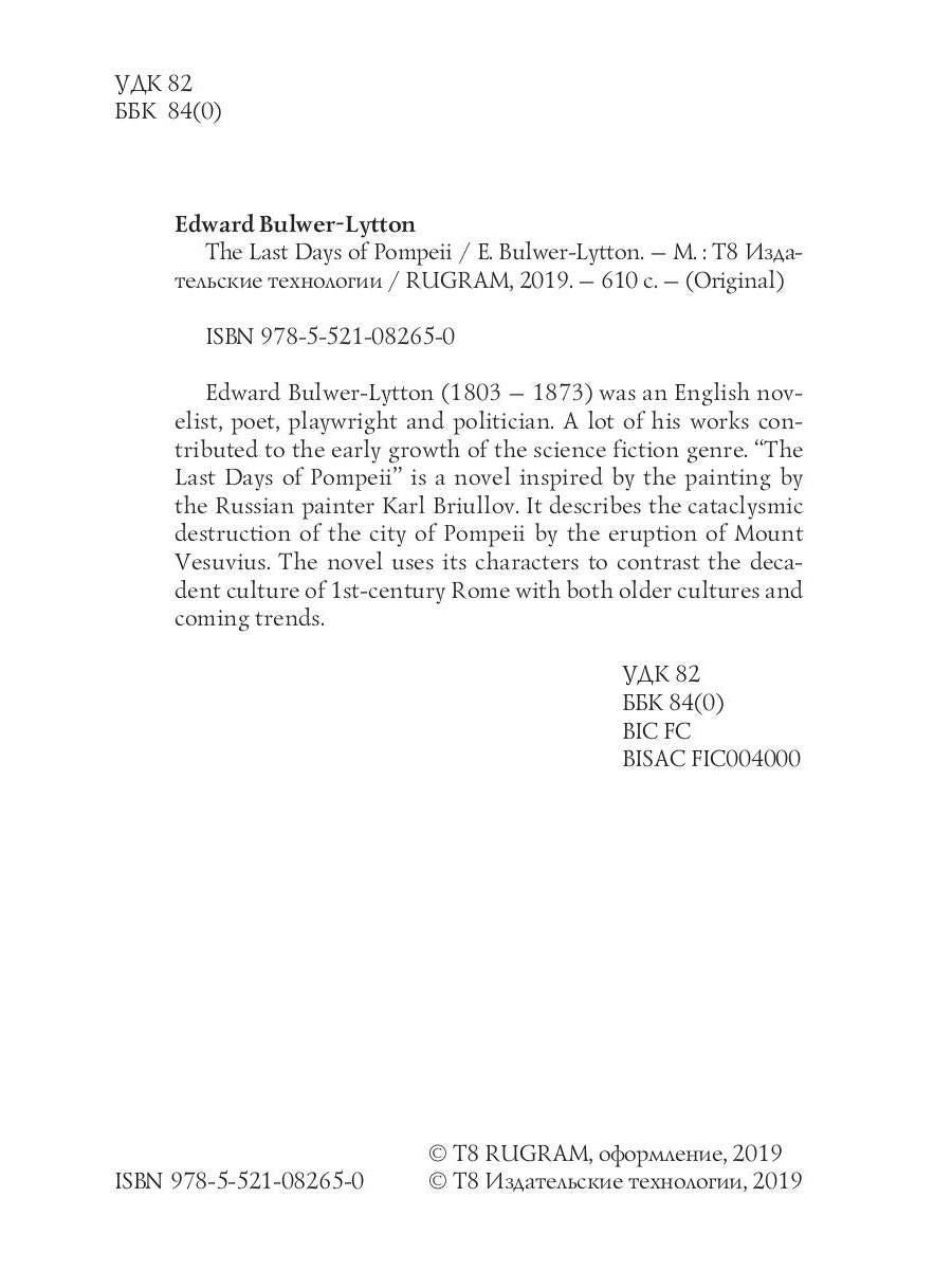 Handling time: 19 days Автор: Бульвер-Литтон Эдвард Джордж, «The Last Days of Pompeii. Последние дни Помпеи: на англ.яз»: Edward Bulwer-Lytton (1803 — 1873) was an English novelist, poet, playwright and politician. A lot of his works contributed to the early growth of the science fiction genre. "The Last Days of Pompeii" is a novel inspired by the painting by the Russian painter Karl Briullov. It describes the cataclysmic destruction of the city of Pompeii by the eruption of Mount Vesuvius. The novel uses its characters to contrast the decadent culture of 1 st-century Rome with both older cultures and coming trends.