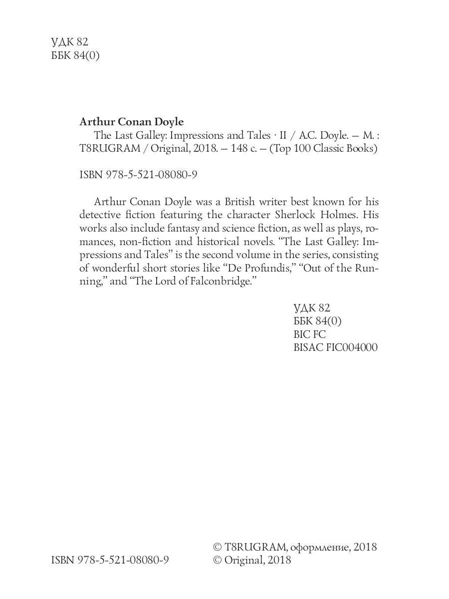 Handling time: 19 days Автор: Doyle Arthur Conan, «The Last Galley: Impressions and Tales 2 = Последняя галерея: впечатления и рассказы 2: на англ.яз»: Arthur Conan Doyle was a British writer best known for his detective fiction featuring the character Sherlock Holmes. His works also include fantasy and science fiction, as well as plays, romances, non-fiction and historical novels. "The Last Galley: Impressions and Tales" is the second volume in the series, consisting of wonderful short stories like "De Profundis," "Out of the Running," and "The Lord of Falconbridge."