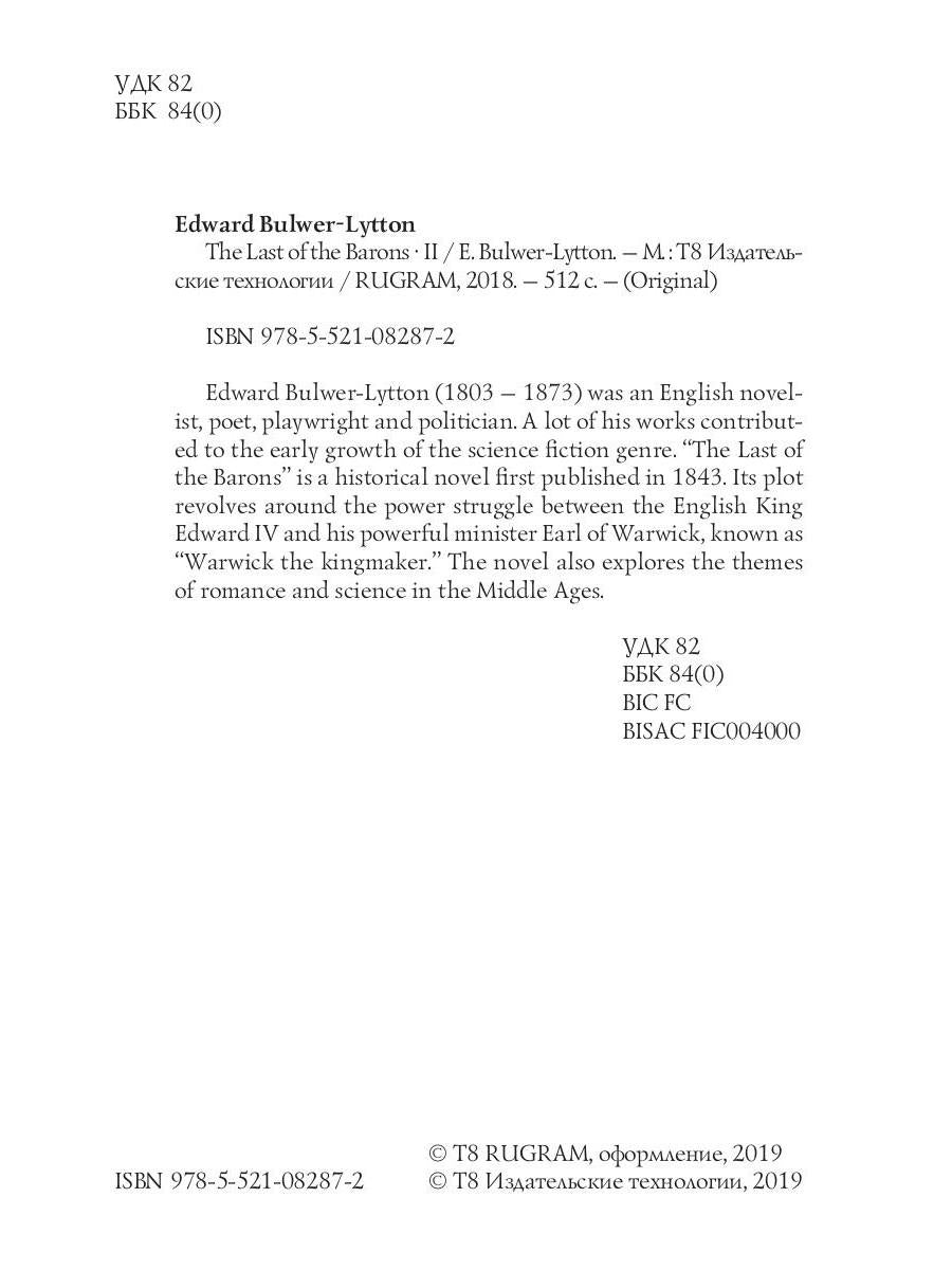 Handling time: 19 days Автор: Bulwer-Lytton E., «The Last of the Barons 2 = Последний барон 2: на англ.яз»: Edward Bulwer-Lytton (1803 — 1873) was an English novelist, poet, playwright and politician. A lot of his works contributed to the early growth of the science fiction genre. "The Last of the Barons" is a historical novel first published in 1843. Its plot revolves around the power struggle between the English King Edward IV and his powerful minister Earl of Warwick, known as "Warwick the kingmaker." The novel also explores the themes of romance and science in the Middle Ages.