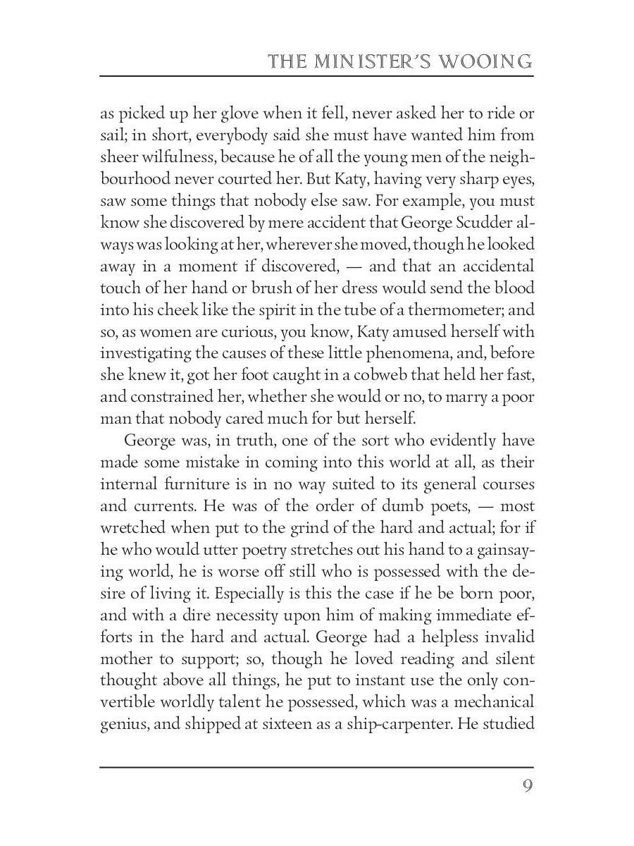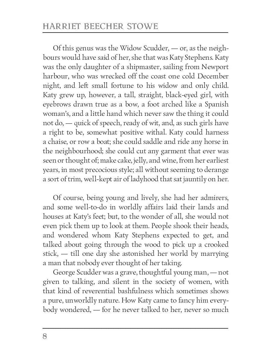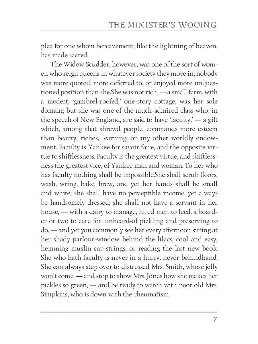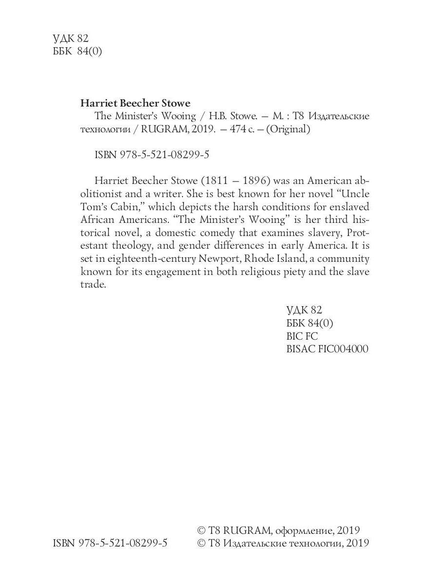 Handling time: 19 days Автор: Stowe H., «The Minister's Wooing = Сватовство священника»: Harriet Beecher Stowe (1811 — 1896) was an American abolitionist and a writer. She is best known for her novel "Uncle Tom's Cabin," which depicts the harsh conditions for enslaved African Americans. "The Minister's Wooing" is her third historical novel, a domestic comedy that examines slavery, Protestant theology, and gender differences in early America. It is set in eighteenth-century Newport, Rhode Island, a community known for its engagement in both religious piety and the slave trade.