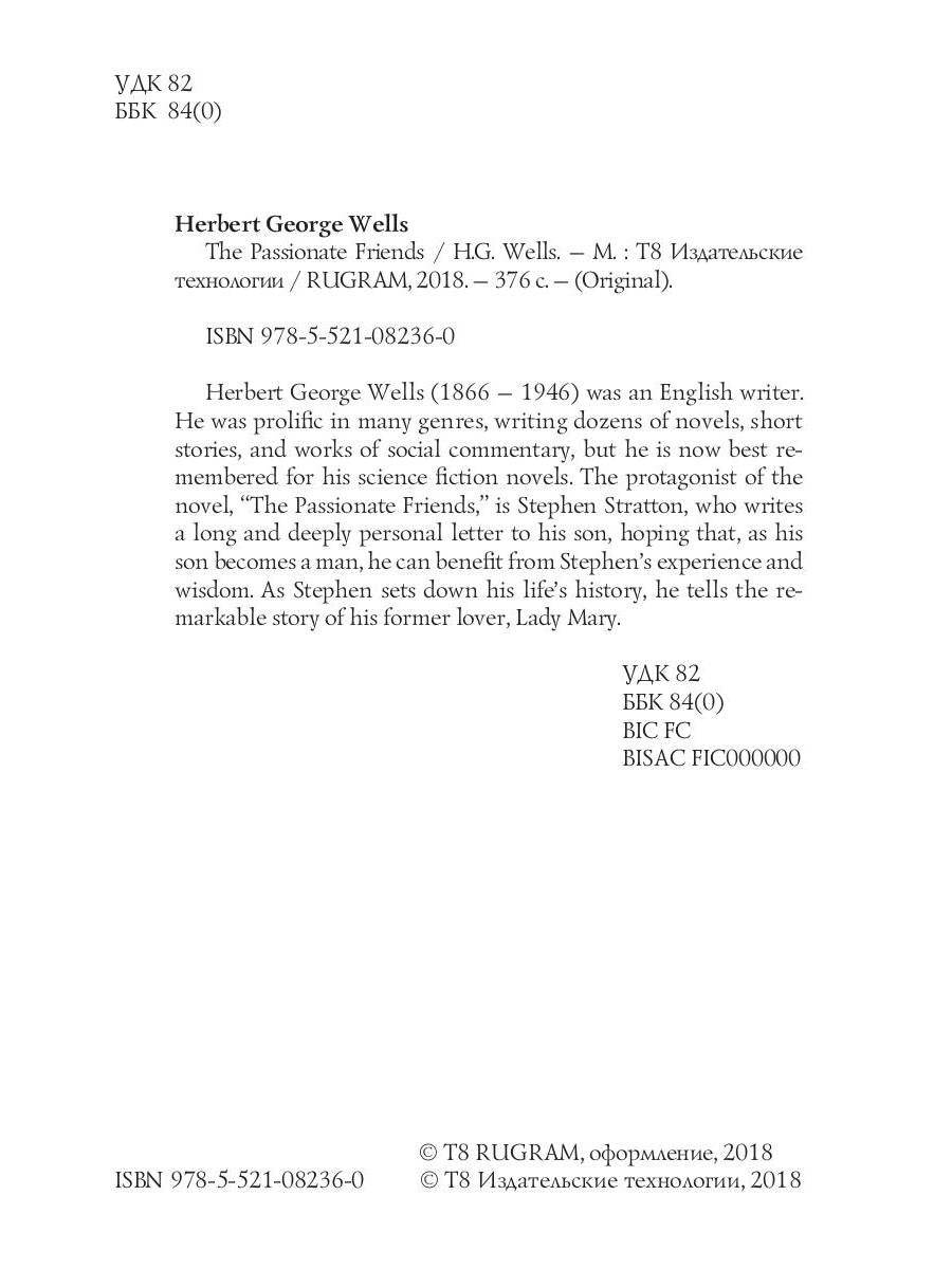 Handling time: 19 days Автор: Wells Herbert George, «The Passionate Friends = Страстная дружба: на англ.яз»: Herbert George Wells (1866 — 1946) was an English writer. He was prolific in many genres, writing dozens of novels, short stories, and works of social commentary, but he is now best remembered for his science fiction novels, The protagonist of the novel, "The Passionate Friends," is Stephen Stratton, who writes a long and deeply personal letter to his son, hoping that, as his son becomes a man, he can benefit from Stephen's experience and wisdom. As Stephen sets down his life's history, he tells the remarkable story of his former lover, Lady Mary.