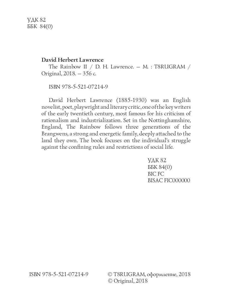 Handling time: 19 days Автор: Lawrence David Herbert, «The Rainbow 2 = Радуга 2: на англ.яз»: David Herbert Lawrence (1885-1930) was an English novelist, poet, playwright and literary critic, one of the key writers of the early twentieth century, most famous for his criticism of rationalism and industrialization. Set in the Nottinghamshire, England, The Rainbow follows three generations of the Brangwens, a strong and energetic family, deeply attached to the land they own. The book focuses on the individual's struggle against the confining rules and restrictions of social life.