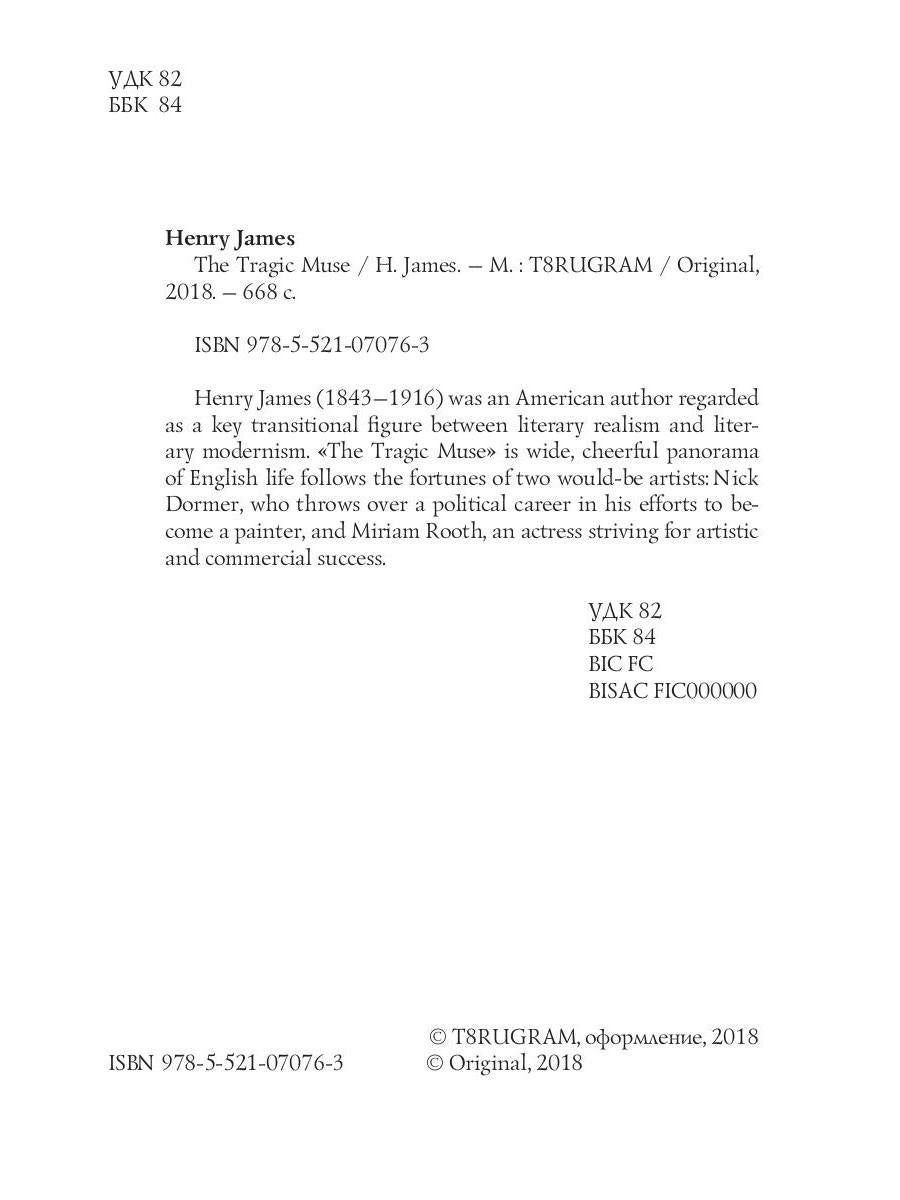 Handling time: 19 days Автор: James Henry, «The Tragic Muse = Трагическая муза (на английском языке)»: Henry James (1843—1916) was an American author regarded as a key transitional figure between literary realism and literary modernism. «The Tragic Muse» is wide, cheerful panorama of English life follows the fortunes of two would-be artists: Nick Dormer, who throws over a political career in his efforts to become a painter, and Miriam Rooth, an actress striving for artistic and commercial success.